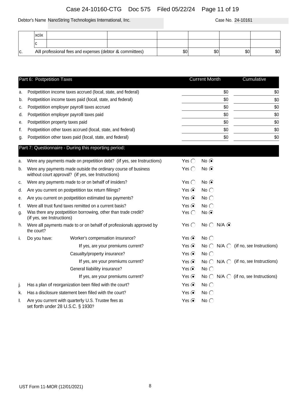 UST Form 11-MOR (12/01/2021) 8 Debtor's Name NanoString Technologies International, Inc. Case No. 24-10161 xcix c c. All professional fees and expenses (debtor & committees) $0 $0 $0 $0 Part 6: Postpetition Taxes Current Month Cumulative a. Postpetition income taxes accrued (local, state, and federal) $0 $0 b. Postpetition income taxes paid (local, state, and federal) $0 $0 c. Postpetition employer payroll taxes accrued $0 $0 d. Postpetition employer payroll taxes paid $0 $0 e. Postpetition property taxes paid $0 $0 f. Postpetition other taxes accrued (local, state, and federal) $0 $0 g. Postpetition other taxes paid (local, state, and federal) $0 $0 Part 7: Questionnaire - During this reporting period: a. Were any payments made on prepetition debt? (if yes, see Instructions) Yes No b. Yes NoWere any payments made outside the ordinary course of business without court approval? (if yes, see Instructions) c. Yes NoWere any payments made to or on behalf of insiders? d. Yes NoAre you current on postpetition tax return filings? e. Yes NoAre you current on postpetition estimated tax payments? f. Were all trust fund taxes remitted on a current basis? Yes No g. Yes NoWas there any postpetition borrowing, other than trade credit? (if yes, see Instructions) h. Were all payments made to or on behalf of professionals approved by the court? Yes No N/A i. Do you have: Worker's compensation insurance? Yes No If yes, are your premiums current? Yes No N/A (if no, see Instructions) Casualty/property insurance? Yes No If yes, are your premiums current? Yes No N/A (if no, see Instructions) General liability insurance? Yes No If yes, are your premiums current? Yes No N/A (if no, see Instructions) j. Has a plan of reorganization been filed with the court? Yes No k. Has a disclosure statement been filed with the court? Yes No l. Are you current with quarterly U.S. Trustee fees as set forth under 28 U.S.C. § 1930? Yes No Case 24-10160-CTG Doc 575 Filed 05/22/24 Page 11 of 19