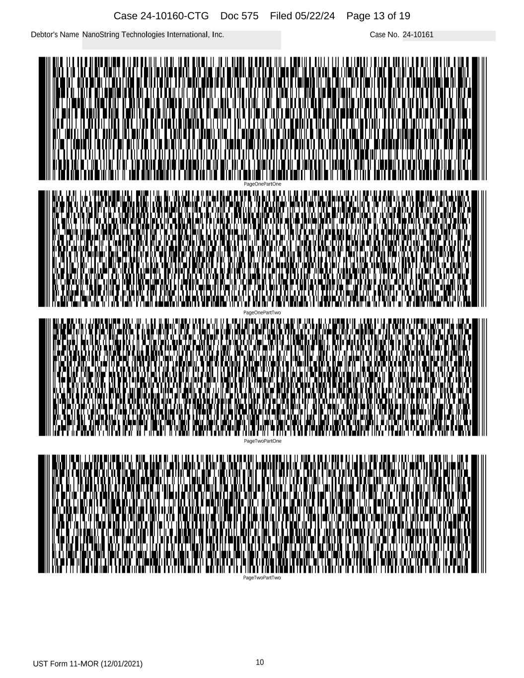 UST Form 11-MOR (12/01/2021) 10 Debtor's Name NanoString Technologies International, Inc. Case No. 24-10161 PageOnePartOne PageOnePartTwo PageTwoPartOne PageTwoPartTwo Case 24-10160-CTG Doc 575 Filed 05/22/24 Page 13 of 19