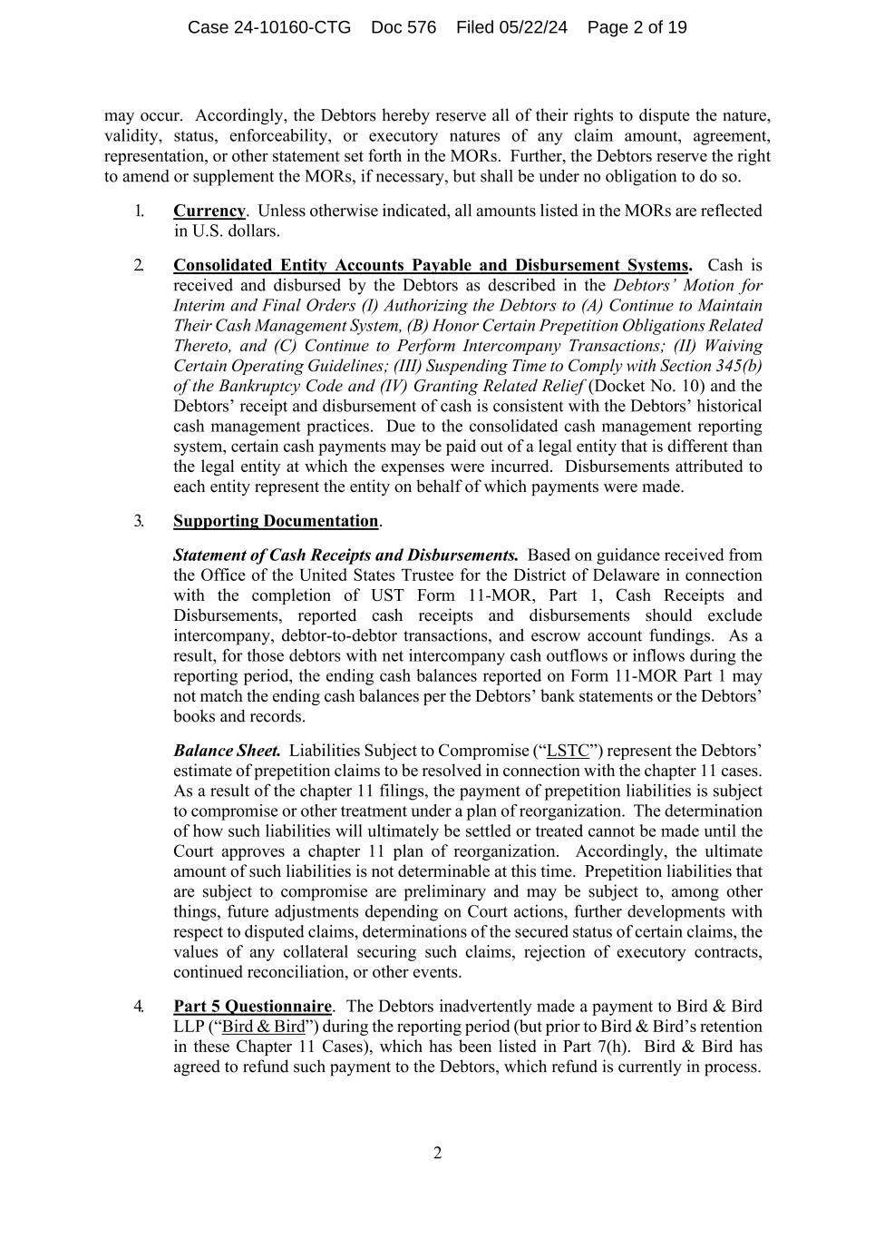 2 may occur. Accordingly, the Debtors hereby reserve all of their rights to dispute the nature, validity, status, enforceability, or executory natures of any claim amount, agreement, representation, or other statement set forth in the MORs. Further, the Debtors reserve the right to amend or supplement the MORs, if necessary, but shall be under no obligation to do so. 1. Currency. Unless otherwise indicated, all amounts listed in the MORs are reflected in U.S. dollars. 2. Consolidated Entity Accounts Payable and Disbursement Systems. Cash is received and disbursed by the Debtors as described in the Debtors’ Motion for Interim and Final Orders (I) Authorizing the Debtors to (A) Continue to Maintain Their Cash Management System, (B) Honor Certain Prepetition Obligations Related Thereto, and (C) Continue to Perform Intercompany Transactions; (II) Waiving Certain Operating Guidelines; (III) Suspending Time to Comply with Section 345(b) of the Bankruptcy Code and (IV) Granting Related Relief (Docket No. 10) and the Debtors’ receipt and disbursement of cash is consistent with the Debtors’ historical cash management practices. Due to the consolidated cash management reporting system, certain cash payments may be paid out of a legal entity that is different than the legal entity at which the expenses were incurred. Disbursements attributed to each entity represent the entity on behalf of which payments were made. 3. Supporting Documentation. Statement of Cash Receipts and Disbursements. Based on guidance received from the Office of the United States Trustee for the District of Delaware in connection with the completion of UST Form 11-MOR, Part 1, Cash Receipts and Disbursements, reported cash receipts and disbursements should exclude intercompany, debtor-to-debtor transactions, and escrow account fundings. As a result, for those debtors with net intercompany cash outflows or inflows during the reporting period, the ending cash balances reported on Form 11-MOR Part 1 may not match the ending cash balances per the Debtors’ bank statements or the Debtors’ books and records. Balance Sheet. Liabilities Subject to Compromise (“LSTC”) represent the Debtors’ estimate of prepetition claims to be resolved in connection with the chapter 11 cases. As a result of the chapter 11 filings, the payment of prepetition liabilities is subject to compromise or other treatment under a plan of reorganization. The determination of how such liabilities will ultimately be settled or treated cannot be made until the Court approves a chapter 11 plan of reorganization. Accordingly, the ultimate amount of such liabilities is not determinable at this time. Prepetition liabilities that are subject to compromise are preliminary and may be subject to, among other things, future adjustments depending on Court actions, further developments with respect to disputed claims, determinations of the secured status of certain claims, the values of any collateral securing such claims, rejection of executory contracts, continued reconciliation, or other events. 4. Part 5 Questionnaire. The Debtors inadvertently made a payment to Bird & Bird LLP (“Bird & Bird”) during the reporting period (but prior to Bird & Bird’s retention in these Chapter 11 Cases), which has been listed in Part 7(h). Bird & Bird has agreed to refund such payment to the Debtors, which refund is currently in process. Case 24-10160-CTG Doc 575 Filed 05/22/24 Page 2 of 19