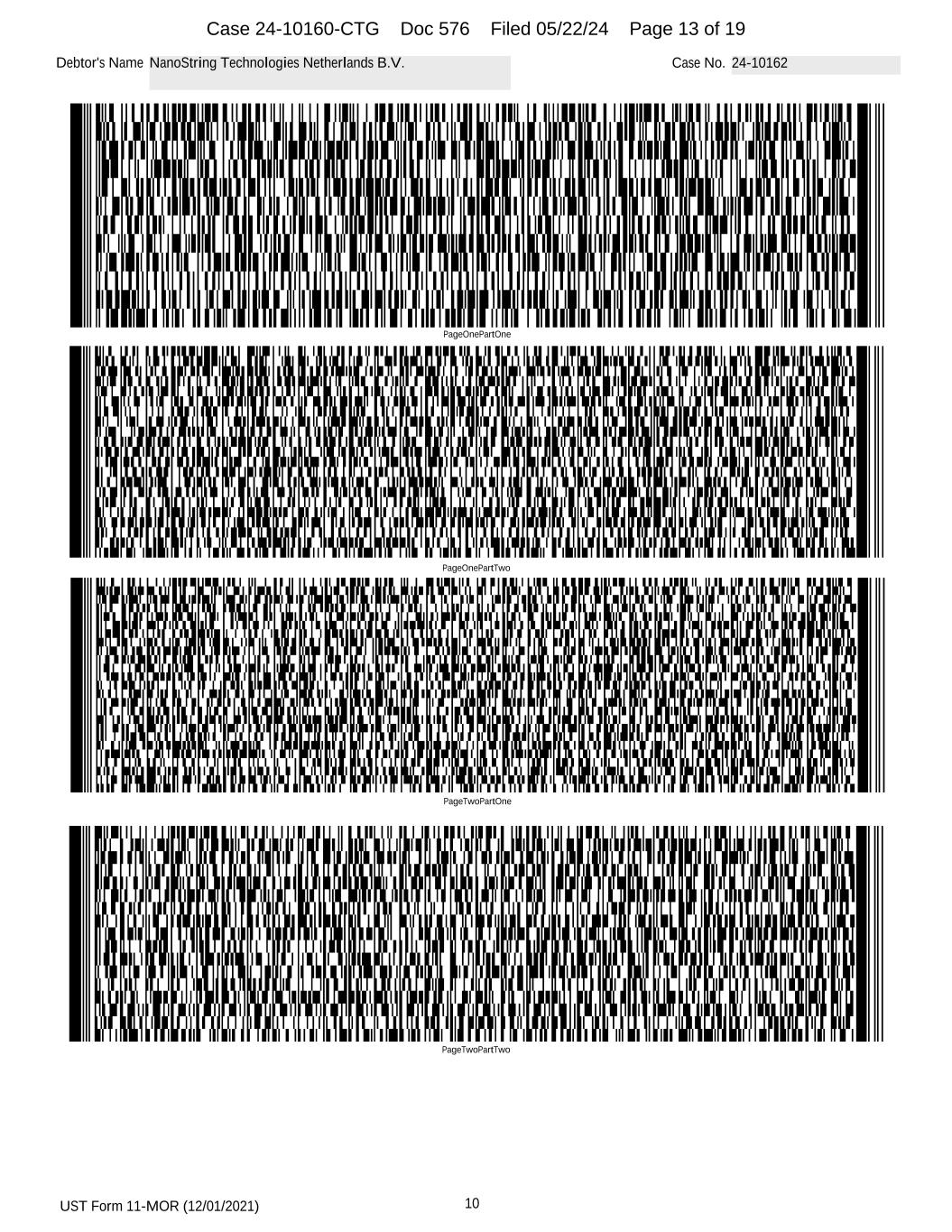 UST Form 11-MOR (12/01/2021) 10 Debtor's Name NanoString Technologies Netherlands B.V. Case No. 24-10162 PageOnePartOne PageOnePartTwo PageTwoPartOne PageTwoPartTwo Case 24-10160-CTG Doc 576 Filed 05/22/24 Page 13 of 19