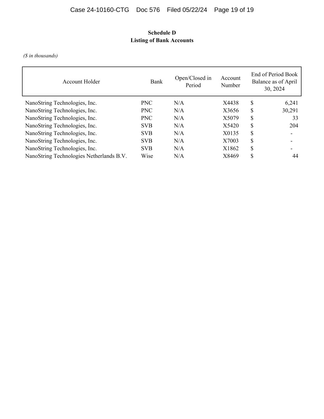 ($ in thousands) Account Holder Bank Open/Closed in Period Account Number End of Period Book Balance as of April 30, 2024 NanoString Technologies, Inc. PNC N/A X4438 6,241$ NanoString Technologies, Inc. PNC N/A X3656 30,291$ NanoString Technologies, Inc. PNC N/A X5079 33$ NanoString Technologies, Inc. SVB N/A X5420 204$ NanoString Technologies, Inc. SVB N/A X0135 -$ NanoString Technologies, Inc. SVB N/A X7003 -$ NanoString Technologies, Inc. SVB N/A X1862 -$ NanoString Technologies Netherlands B.V. Wise N/A X8469 44$ Schedule D Listing of Bank Accounts Case 24-10160-CTG Doc 575 Filed 05/22/24 Page 19 of 19