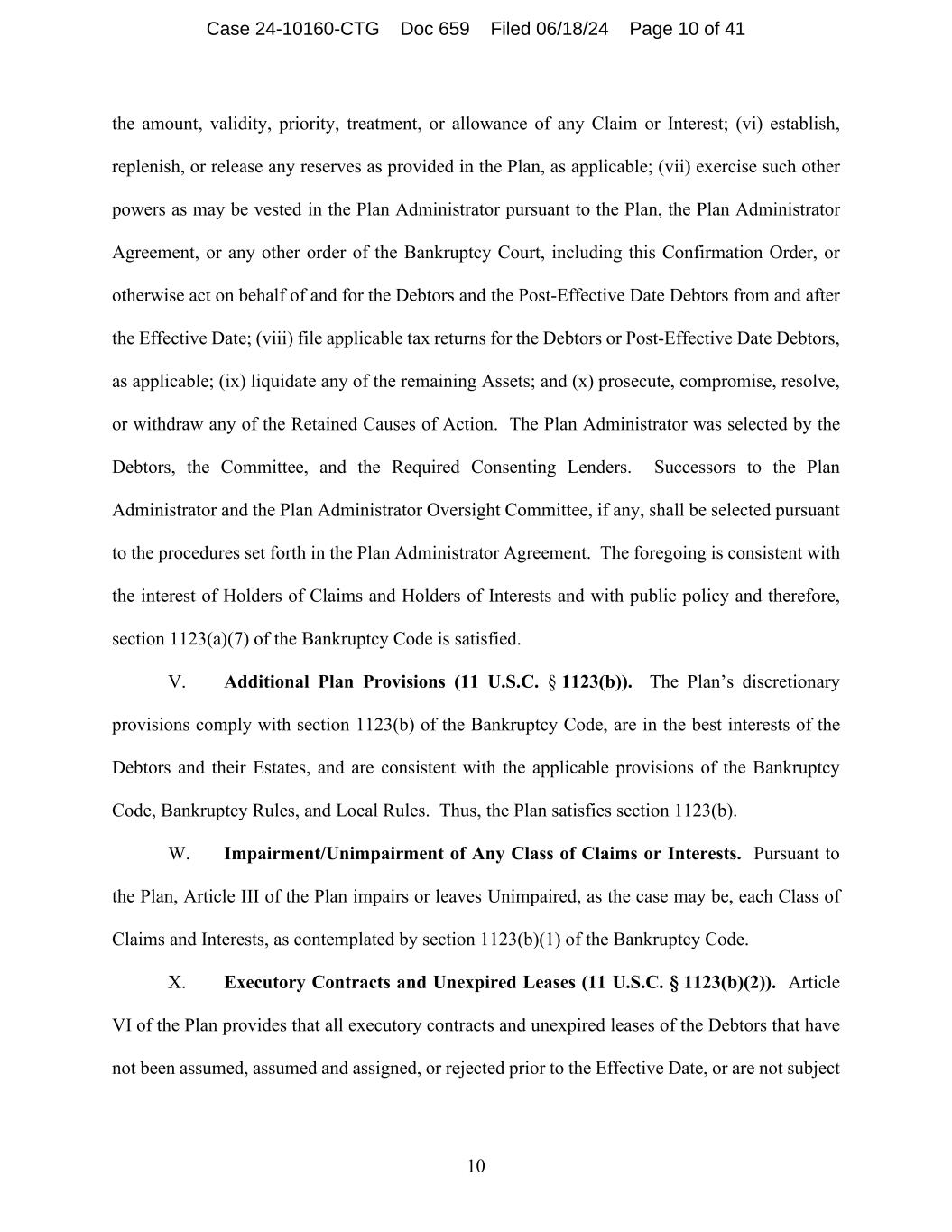 10 the amount, validity, priority, treatment, or allowance of any Claim or Interest; (vi) establish, replenish, or release any reserves as provided in the Plan, as applicable; (vii) exercise such other powers as may be vested in the Plan Administrator pursuant to the Plan, the Plan Administrator Agreement, or any other order of the Bankruptcy Court, including this Confirmation Order, or otherwise act on behalf of and for the Debtors and the Post-Effective Date Debtors from and after the Effective Date; (viii) file applicable tax returns for the Debtors or Post-Effective Date Debtors, as applicable; (ix) liquidate any of the remaining Assets; and (x) prosecute, compromise, resolve, or withdraw any of the Retained Causes of Action. The Plan Administrator was selected by the Debtors, the Committee, and the Required Consenting Lenders. Successors to the Plan Administrator and the Plan Administrator Oversight Committee, if any, shall be selected pursuant to the procedures set forth in the Plan Administrator Agreement. The foregoing is consistent with the interest of Holders of Claims and Holders of Interests and with public policy and therefore, section 1123(a)(7) of the Bankruptcy Code is satisfied. V. Additional Plan Provisions (11 U.S.C. § 1123(b)). The Plan’s discretionary provisions comply with section 1123(b) of the Bankruptcy Code, are in the best interests of the Debtors and their Estates, and are consistent with the applicable provisions of the Bankruptcy Code, Bankruptcy Rules, and Local Rules. Thus, the Plan satisfies section 1123(b). W. Impairment/Unimpairment of Any Class of Claims or Interests. Pursuant to the Plan, Article III of the Plan impairs or leaves Unimpaired, as the case may be, each Class of Claims and Interests, as contemplated by section 1123(b)(1) of the Bankruptcy Code. X. Executory Contracts and Unexpired Leases (11 U.S.C. § 1123(b)(2)). Article VI of the Plan provides that all executory contracts and unexpired leases of the Debtors that have not been assumed, assumed and assigned, or rejected prior to the Effective Date, or are not subject Case 24-10160-CTG Doc 659 Filed 06/18/24 Page 10 of 41