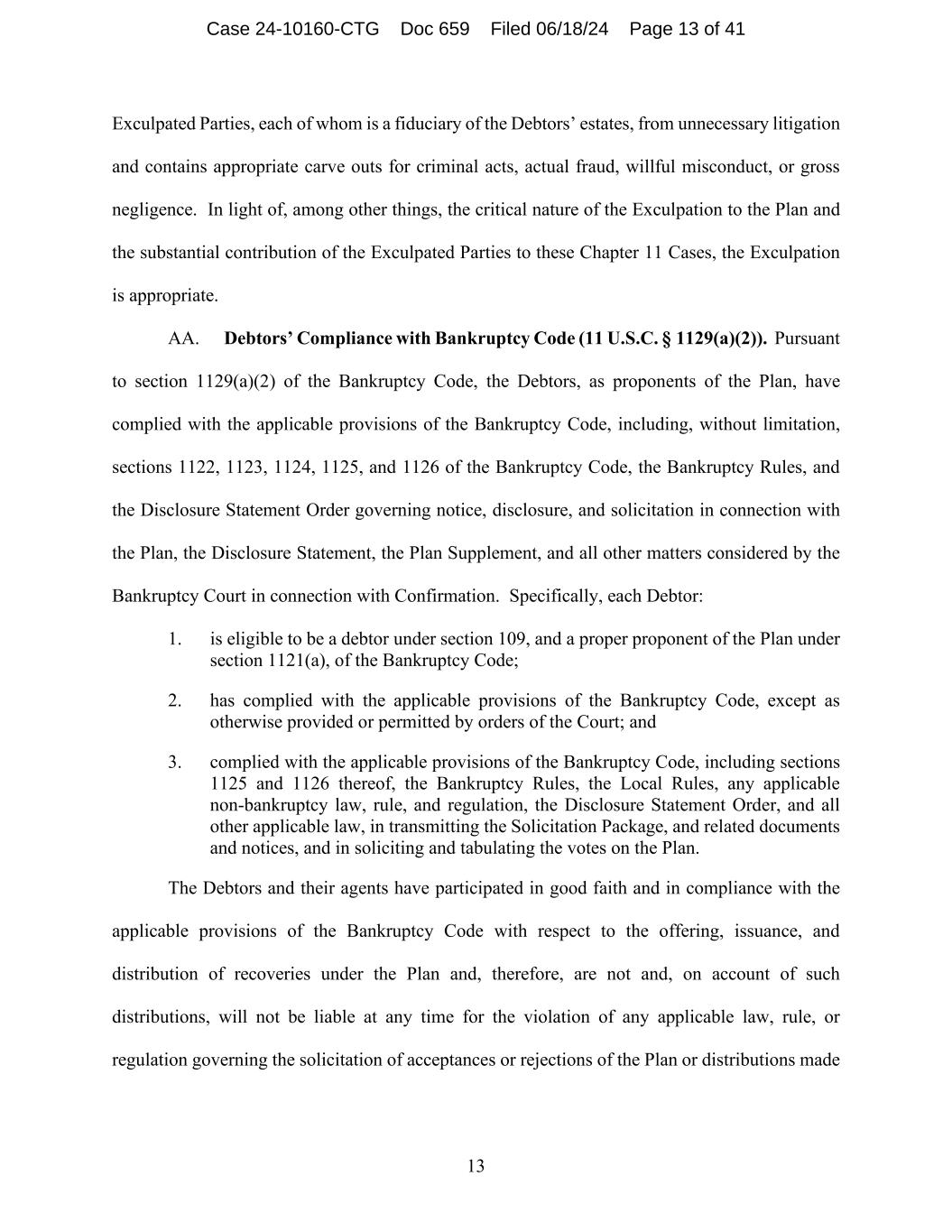 13 Exculpated Parties, each of whom is a fiduciary of the Debtors’ estates, from unnecessary litigation and contains appropriate carve outs for criminal acts, actual fraud, willful misconduct, or gross negligence. In light of, among other things, the critical nature of the Exculpation to the Plan and the substantial contribution of the Exculpated Parties to these Chapter 11 Cases, the Exculpation is appropriate. AA. Debtors’ Compliance with Bankruptcy Code (11 U.S.C. § 1129(a)(2)). Pursuant to section 1129(a)(2) of the Bankruptcy Code, the Debtors, as proponents of the Plan, have complied with the applicable provisions of the Bankruptcy Code, including, without limitation, sections 1122, 1123, 1124, 1125, and 1126 of the Bankruptcy Code, the Bankruptcy Rules, and the Disclosure Statement Order governing notice, disclosure, and solicitation in connection with the Plan, the Disclosure Statement, the Plan Supplement, and all other matters considered by the Bankruptcy Court in connection with Confirmation. Specifically, each Debtor: 1. is eligible to be a debtor under section 109, and a proper proponent of the Plan under section 1121(a), of the Bankruptcy Code; 2. has complied with the applicable provisions of the Bankruptcy Code, except as otherwise provided or permitted by orders of the Court; and 3. complied with the applicable provisions of the Bankruptcy Code, including sections 1125 and 1126 thereof, the Bankruptcy Rules, the Local Rules, any applicable non-bankruptcy law, rule, and regulation, the Disclosure Statement Order, and all other applicable law, in transmitting the Solicitation Package, and related documents and notices, and in soliciting and tabulating the votes on the Plan. The Debtors and their agents have participated in good faith and in compliance with the applicable provisions of the Bankruptcy Code with respect to the offering, issuance, and distribution of recoveries under the Plan and, therefore, are not and, on account of such distributions, will not be liable at any time for the violation of any applicable law, rule, or regulation governing the solicitation of acceptances or rejections of the Plan or distributions made Case 24-10160-CTG Doc 659 Filed 06/18/24 Page 13 of 41