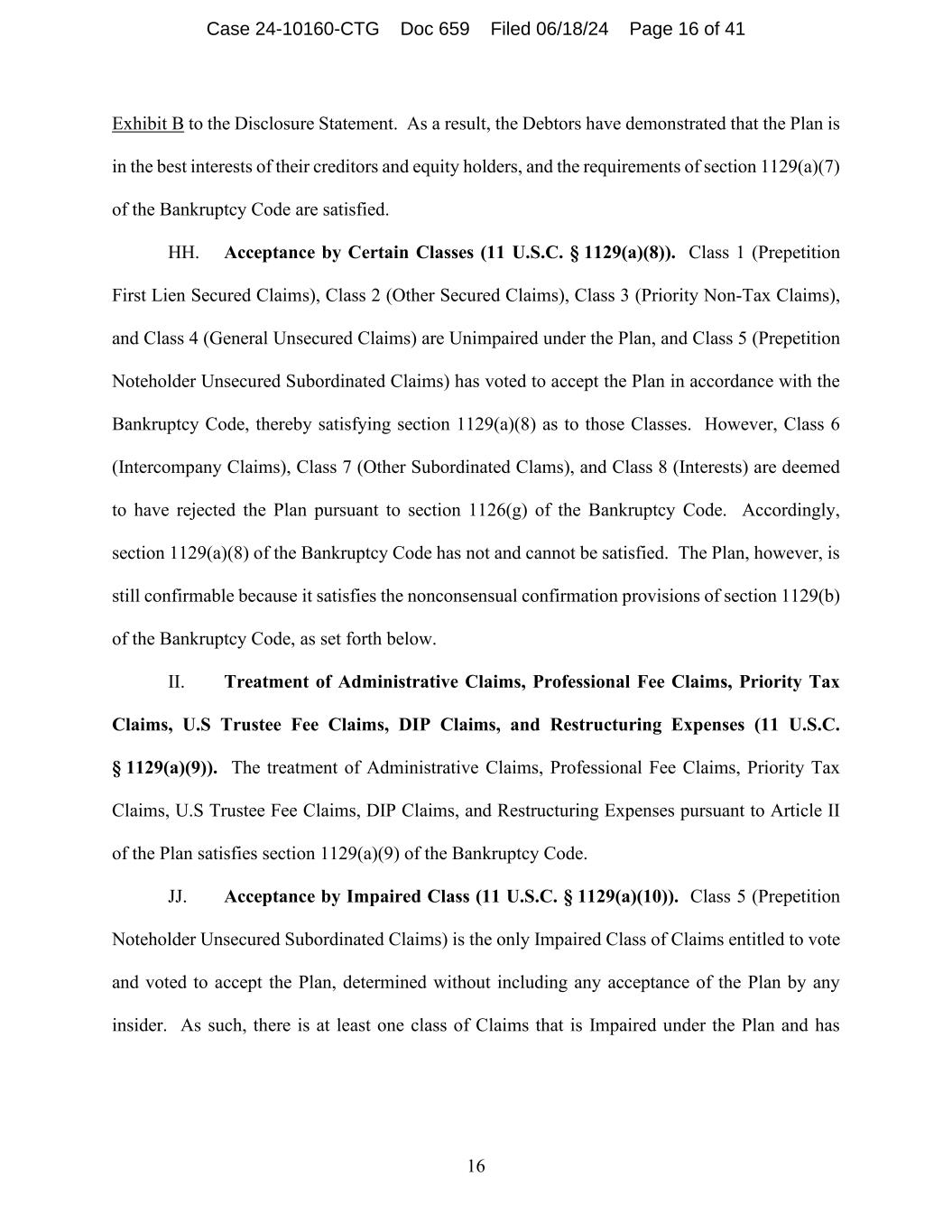 16 Exhibit B to the Disclosure Statement. As a result, the Debtors have demonstrated that the Plan is in the best interests of their creditors and equity holders, and the requirements of section 1129(a)(7) of the Bankruptcy Code are satisfied. HH. Acceptance by Certain Classes (11 U.S.C. § 1129(a)(8)). Class 1 (Prepetition First Lien Secured Claims), Class 2 (Other Secured Claims), Class 3 (Priority Non-Tax Claims), and Class 4 (General Unsecured Claims) are Unimpaired under the Plan, and Class 5 (Prepetition Noteholder Unsecured Subordinated Claims) has voted to accept the Plan in accordance with the Bankruptcy Code, thereby satisfying section 1129(a)(8) as to those Classes. However, Class 6 (Intercompany Claims), Class 7 (Other Subordinated Clams), and Class 8 (Interests) are deemed to have rejected the Plan pursuant to section 1126(g) of the Bankruptcy Code. Accordingly, section 1129(a)(8) of the Bankruptcy Code has not and cannot be satisfied. The Plan, however, is still confirmable because it satisfies the nonconsensual confirmation provisions of section 1129(b) of the Bankruptcy Code, as set forth below. II. Treatment of Administrative Claims, Professional Fee Claims, Priority Tax Claims, U.S Trustee Fee Claims, DIP Claims, and Restructuring Expenses (11 U.S.C. § 1129(a)(9)). The treatment of Administrative Claims, Professional Fee Claims, Priority Tax Claims, U.S Trustee Fee Claims, DIP Claims, and Restructuring Expenses pursuant to Article II of the Plan satisfies section 1129(a)(9) of the Bankruptcy Code. JJ. Acceptance by Impaired Class (11 U.S.C. § 1129(a)(10)). Class 5 (Prepetition Noteholder Unsecured Subordinated Claims) is the only Impaired Class of Claims entitled to vote and voted to accept the Plan, determined without including any acceptance of the Plan by any insider. As such, there is at least one class of Claims that is Impaired under the Plan and has Case 24-10160-CTG Doc 659 Filed 06/18/24 Page 16 of 41