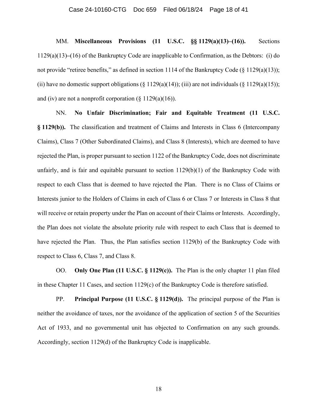 18 MM. Miscellaneous Provisions (11 U.S.C. §§ 1129(a)(13)–(16)). Sections 1129(a)(13)–(16) of the Bankruptcy Code are inapplicable to Confirmation, as the Debtors: (i) do not provide “retiree benefits,” as defined in section 1114 of the Bankruptcy Code (§ 1129(a)(13)); (ii) have no domestic support obligations (§ 1129(a)(14)); (iii) are not individuals (§ 1129(a)(15)); and (iv) are not a nonprofit corporation (§ 1129(a)(16)). NN. No Unfair Discrimination; Fair and Equitable Treatment (11 U.S.C. § 1129(b)). The classification and treatment of Claims and Interests in Class 6 (Intercompany Claims), Class 7 (Other Subordinated Claims), and Class 8 (Interests), which are deemed to have rejected the Plan, is proper pursuant to section 1122 of the Bankruptcy Code, does not discriminate unfairly, and is fair and equitable pursuant to section 1129(b)(1) of the Bankruptcy Code with respect to each Class that is deemed to have rejected the Plan. There is no Class of Claims or Interests junior to the Holders of Claims in each of Class 6 or Class 7 or Interests in Class 8 that will receive or retain property under the Plan on account of their Claims or Interests. Accordingly, the Plan does not violate the absolute priority rule with respect to each Class that is deemed to have rejected the Plan. Thus, the Plan satisfies section 1129(b) of the Bankruptcy Code with respect to Class 6, Class 7, and Class 8. OO. Only One Plan (11 U.S.C. § 1129(c)). The Plan is the only chapter 11 plan filed in these Chapter 11 Cases, and section 1129(c) of the Bankruptcy Code is therefore satisfied. PP. Principal Purpose (11 U.S.C. § 1129(d)). The principal purpose of the Plan is neither the avoidance of taxes, nor the avoidance of the application of section 5 of the Securities Act of 1933, and no governmental unit has objected to Confirmation on any such grounds. Accordingly, section 1129(d) of the Bankruptcy Code is inapplicable. Case 24-10160-CTG Doc 659 Filed 06/18/24 Page 18 of 41