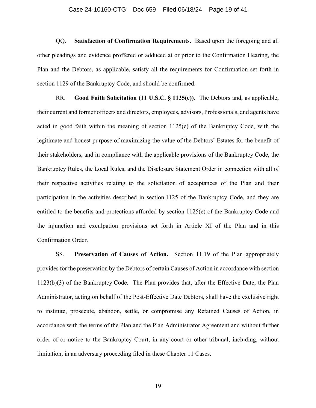 19 QQ. Satisfaction of Confirmation Requirements. Based upon the foregoing and all other pleadings and evidence proffered or adduced at or prior to the Confirmation Hearing, the Plan and the Debtors, as applicable, satisfy all the requirements for Confirmation set forth in section 1129 of the Bankruptcy Code, and should be confirmed. RR. Good Faith Solicitation (11 U.S.C. § 1125(e)). The Debtors and, as applicable, their current and former officers and directors, employees, advisors, Professionals, and agents have acted in good faith within the meaning of section 1125(e) of the Bankruptcy Code, with the legitimate and honest purpose of maximizing the value of the Debtors’ Estates for the benefit of their stakeholders, and in compliance with the applicable provisions of the Bankruptcy Code, the Bankruptcy Rules, the Local Rules, and the Disclosure Statement Order in connection with all of their respective activities relating to the solicitation of acceptances of the Plan and their participation in the activities described in section 1125 of the Bankruptcy Code, and they are entitled to the benefits and protections afforded by section 1125(e) of the Bankruptcy Code and the injunction and exculpation provisions set forth in Article XI of the Plan and in this Confirmation Order. SS. Preservation of Causes of Action. Section 11.19 of the Plan appropriately provides for the preservation by the Debtors of certain Causes of Action in accordance with section 1123(b)(3) of the Bankruptcy Code. The Plan provides that, after the Effective Date, the Plan Administrator, acting on behalf of the Post-Effective Date Debtors, shall have the exclusive right to institute, prosecute, abandon, settle, or compromise any Retained Causes of Action, in accordance with the terms of the Plan and the Plan Administrator Agreement and without further order of or notice to the Bankruptcy Court, in any court or other tribunal, including, without limitation, in an adversary proceeding filed in these Chapter 11 Cases. Case 24-10160-CTG Doc 659 Filed 06/18/24 Page 19 of 41