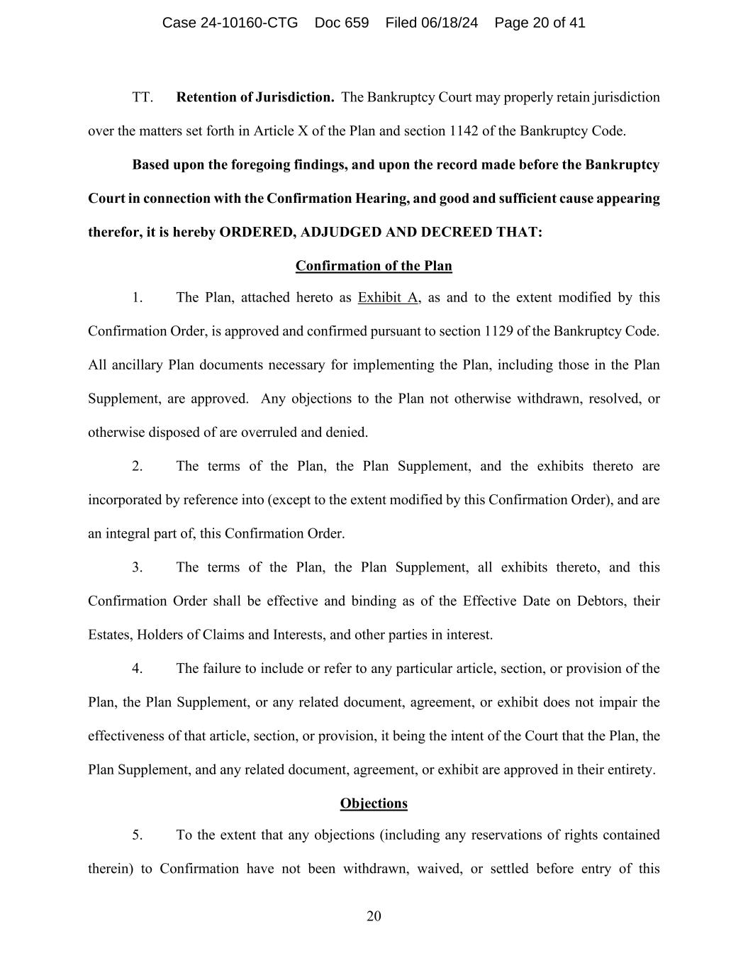 20 TT. Retention of Jurisdiction. The Bankruptcy Court may properly retain jurisdiction over the matters set forth in Article X of the Plan and section 1142 of the Bankruptcy Code. Based upon the foregoing findings, and upon the record made before the Bankruptcy Court in connection with the Confirmation Hearing, and good and sufficient cause appearing therefor, it is hereby ORDERED, ADJUDGED AND DECREED THAT: Confirmation of the Plan 1. The Plan, attached hereto as Exhibit A, as and to the extent modified by this Confirmation Order, is approved and confirmed pursuant to section 1129 of the Bankruptcy Code. All ancillary Plan documents necessary for implementing the Plan, including those in the Plan Supplement, are approved. Any objections to the Plan not otherwise withdrawn, resolved, or otherwise disposed of are overruled and denied. 2. The terms of the Plan, the Plan Supplement, and the exhibits thereto are incorporated by reference into (except to the extent modified by this Confirmation Order), and are an integral part of, this Confirmation Order. 3. The terms of the Plan, the Plan Supplement, all exhibits thereto, and this Confirmation Order shall be effective and binding as of the Effective Date on Debtors, their Estates, Holders of Claims and Interests, and other parties in interest. 4. The failure to include or refer to any particular article, section, or provision of the Plan, the Plan Supplement, or any related document, agreement, or exhibit does not impair the effectiveness of that article, section, or provision, it being the intent of the Court that the Plan, the Plan Supplement, and any related document, agreement, or exhibit are approved in their entirety. Objections 5. To the extent that any objections (including any reservations of rights contained therein) to Confirmation have not been withdrawn, waived, or settled before entry of this Case 24-10160-CTG Doc 659 Filed 06/18/24 Page 20 of 41