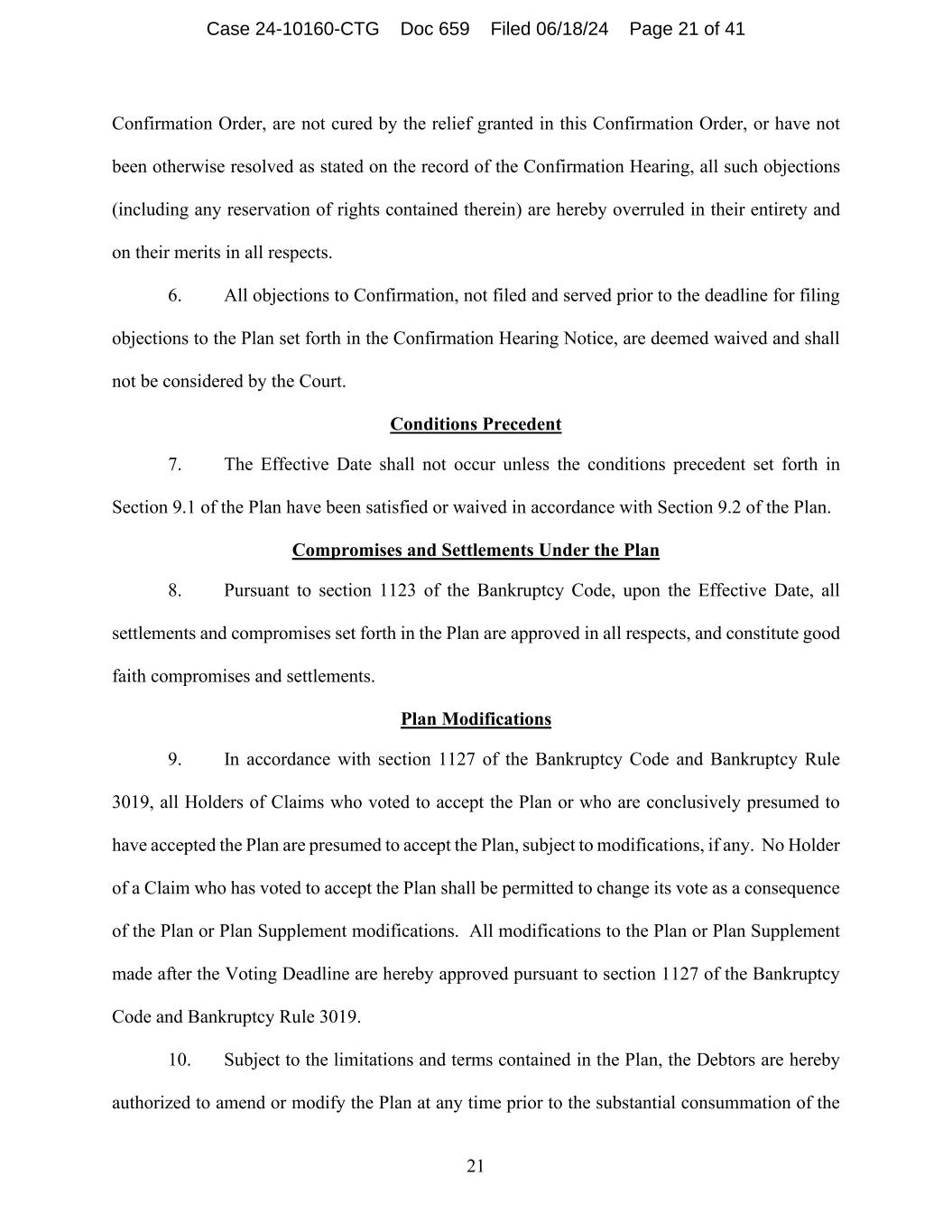 21 Confirmation Order, are not cured by the relief granted in this Confirmation Order, or have not been otherwise resolved as stated on the record of the Confirmation Hearing, all such objections (including any reservation of rights contained therein) are hereby overruled in their entirety and on their merits in all respects. 6. All objections to Confirmation, not filed and served prior to the deadline for filing objections to the Plan set forth in the Confirmation Hearing Notice, are deemed waived and shall not be considered by the Court. Conditions Precedent 7. The Effective Date shall not occur unless the conditions precedent set forth in Section 9.1 of the Plan have been satisfied or waived in accordance with Section 9.2 of the Plan. Compromises and Settlements Under the Plan 8. Pursuant to section 1123 of the Bankruptcy Code, upon the Effective Date, all settlements and compromises set forth in the Plan are approved in all respects, and constitute good faith compromises and settlements. Plan Modifications 9. In accordance with section 1127 of the Bankruptcy Code and Bankruptcy Rule 3019, all Holders of Claims who voted to accept the Plan or who are conclusively presumed to have accepted the Plan are presumed to accept the Plan, subject to modifications, if any. No Holder of a Claim who has voted to accept the Plan shall be permitted to change its vote as a consequence of the Plan or Plan Supplement modifications. All modifications to the Plan or Plan Supplement made after the Voting Deadline are hereby approved pursuant to section 1127 of the Bankruptcy Code and Bankruptcy Rule 3019. 10. Subject to the limitations and terms contained in the Plan, the Debtors are hereby authorized to amend or modify the Plan at any time prior to the substantial consummation of the Case 24-10160-CTG Doc 659 Filed 06/18/24 Page 21 of 41