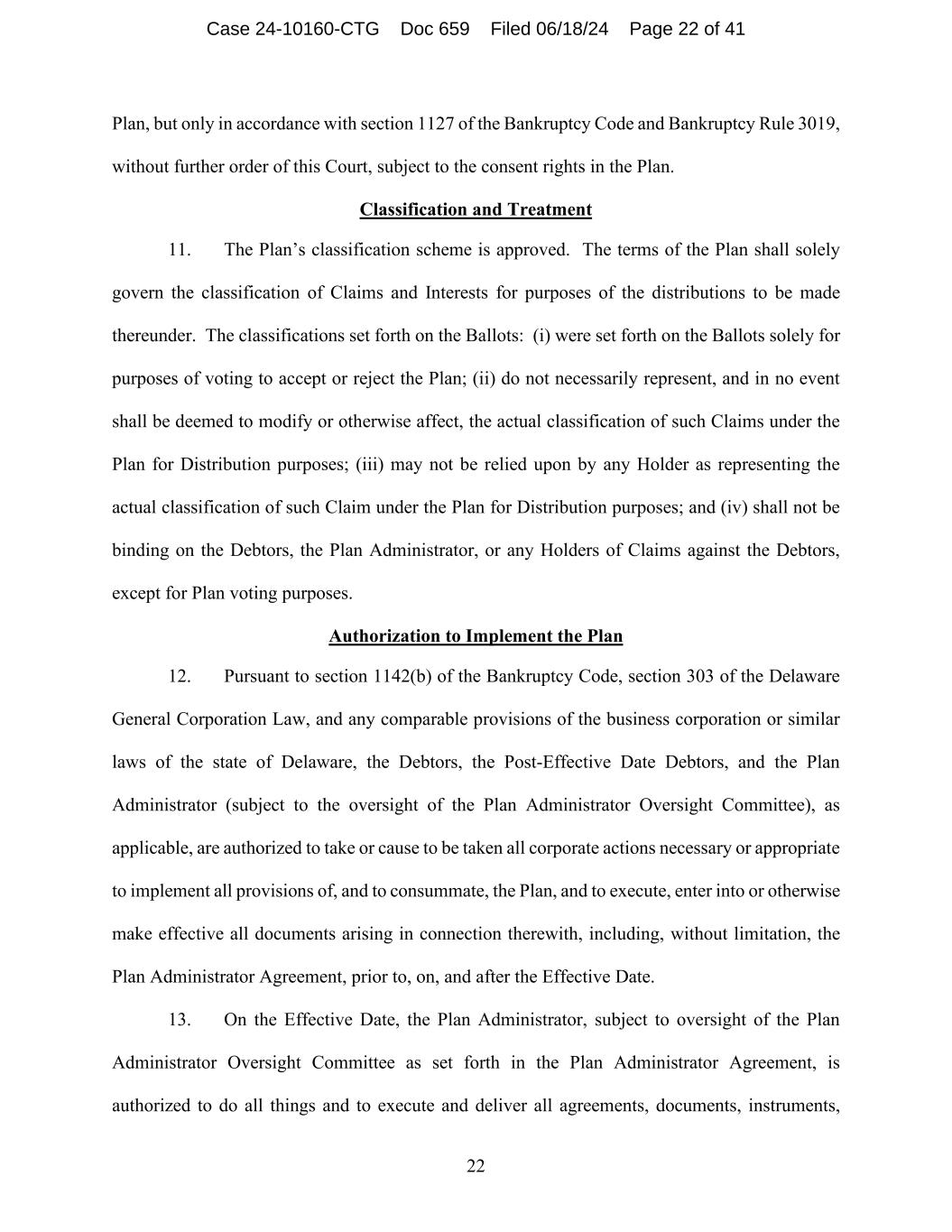 22 Plan, but only in accordance with section 1127 of the Bankruptcy Code and Bankruptcy Rule 3019, without further order of this Court, subject to the consent rights in the Plan. Classification and Treatment 11. The Plan’s classification scheme is approved. The terms of the Plan shall solely govern the classification of Claims and Interests for purposes of the distributions to be made thereunder. The classifications set forth on the Ballots: (i) were set forth on the Ballots solely for purposes of voting to accept or reject the Plan; (ii) do not necessarily represent, and in no event shall be deemed to modify or otherwise affect, the actual classification of such Claims under the Plan for Distribution purposes; (iii) may not be relied upon by any Holder as representing the actual classification of such Claim under the Plan for Distribution purposes; and (iv) shall not be binding on the Debtors, the Plan Administrator, or any Holders of Claims against the Debtors, except for Plan voting purposes. Authorization to Implement the Plan 12. Pursuant to section 1142(b) of the Bankruptcy Code, section 303 of the Delaware General Corporation Law, and any comparable provisions of the business corporation or similar laws of the state of Delaware, the Debtors, the Post-Effective Date Debtors, and the Plan Administrator (subject to the oversight of the Plan Administrator Oversight Committee), as applicable, are authorized to take or cause to be taken all corporate actions necessary or appropriate to implement all provisions of, and to consummate, the Plan, and to execute, enter into or otherwise make effective all documents arising in connection therewith, including, without limitation, the Plan Administrator Agreement, prior to, on, and after the Effective Date. 13. On the Effective Date, the Plan Administrator, subject to oversight of the Plan Administrator Oversight Committee as set forth in the Plan Administrator Agreement, is authorized to do all things and to execute and deliver all agreements, documents, instruments, Case 24-10160-CTG Doc 659 Filed 06/18/24 Page 22 of 41