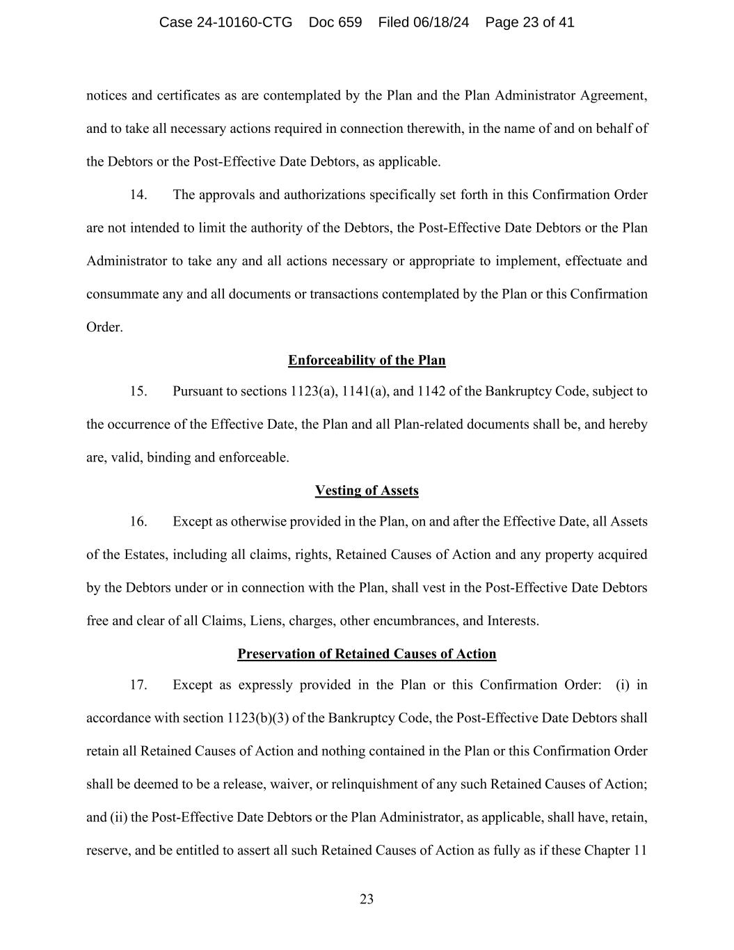 23 notices and certificates as are contemplated by the Plan and the Plan Administrator Agreement, and to take all necessary actions required in connection therewith, in the name of and on behalf of the Debtors or the Post-Effective Date Debtors, as applicable. 14. The approvals and authorizations specifically set forth in this Confirmation Order are not intended to limit the authority of the Debtors, the Post-Effective Date Debtors or the Plan Administrator to take any and all actions necessary or appropriate to implement, effectuate and consummate any and all documents or transactions contemplated by the Plan or this Confirmation Order. Enforceability of the Plan 15. Pursuant to sections 1123(a), 1141(a), and 1142 of the Bankruptcy Code, subject to the occurrence of the Effective Date, the Plan and all Plan-related documents shall be, and hereby are, valid, binding and enforceable. Vesting of Assets 16. Except as otherwise provided in the Plan, on and after the Effective Date, all Assets of the Estates, including all claims, rights, Retained Causes of Action and any property acquired by the Debtors under or in connection with the Plan, shall vest in the Post-Effective Date Debtors free and clear of all Claims, Liens, charges, other encumbrances, and Interests. Preservation of Retained Causes of Action 17. Except as expressly provided in the Plan or this Confirmation Order: (i) in accordance with section 1123(b)(3) of the Bankruptcy Code, the Post-Effective Date Debtors shall retain all Retained Causes of Action and nothing contained in the Plan or this Confirmation Order shall be deemed to be a release, waiver, or relinquishment of any such Retained Causes of Action; and (ii) the Post-Effective Date Debtors or the Plan Administrator, as applicable, shall have, retain, reserve, and be entitled to assert all such Retained Causes of Action as fully as if these Chapter 11 Case 24-10160-CTG Doc 659 Filed 06/18/24 Page 23 of 41