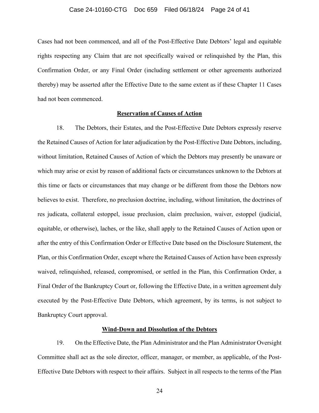 24 Cases had not been commenced, and all of the Post-Effective Date Debtors’ legal and equitable rights respecting any Claim that are not specifically waived or relinquished by the Plan, this Confirmation Order, or any Final Order (including settlement or other agreements authorized thereby) may be asserted after the Effective Date to the same extent as if these Chapter 11 Cases had not been commenced. Reservation of Causes of Action 18. The Debtors, their Estates, and the Post-Effective Date Debtors expressly reserve the Retained Causes of Action for later adjudication by the Post-Effective Date Debtors, including, without limitation, Retained Causes of Action of which the Debtors may presently be unaware or which may arise or exist by reason of additional facts or circumstances unknown to the Debtors at this time or facts or circumstances that may change or be different from those the Debtors now believes to exist. Therefore, no preclusion doctrine, including, without limitation, the doctrines of res judicata, collateral estoppel, issue preclusion, claim preclusion, waiver, estoppel (judicial, equitable, or otherwise), laches, or the like, shall apply to the Retained Causes of Action upon or after the entry of this Confirmation Order or Effective Date based on the Disclosure Statement, the Plan, or this Confirmation Order, except where the Retained Causes of Action have been expressly waived, relinquished, released, compromised, or settled in the Plan, this Confirmation Order, a Final Order of the Bankruptcy Court or, following the Effective Date, in a written agreement duly executed by the Post-Effective Date Debtors, which agreement, by its terms, is not subject to Bankruptcy Court approval. Wind-Down and Dissolution of the Debtors 19. On the Effective Date, the Plan Administrator and the Plan Administrator Oversight Committee shall act as the sole director, officer, manager, or member, as applicable, of the Post- Effective Date Debtors with respect to their affairs. Subject in all respects to the terms of the Plan Case 24-10160-CTG Doc 659 Filed 06/18/24 Page 24 of 41