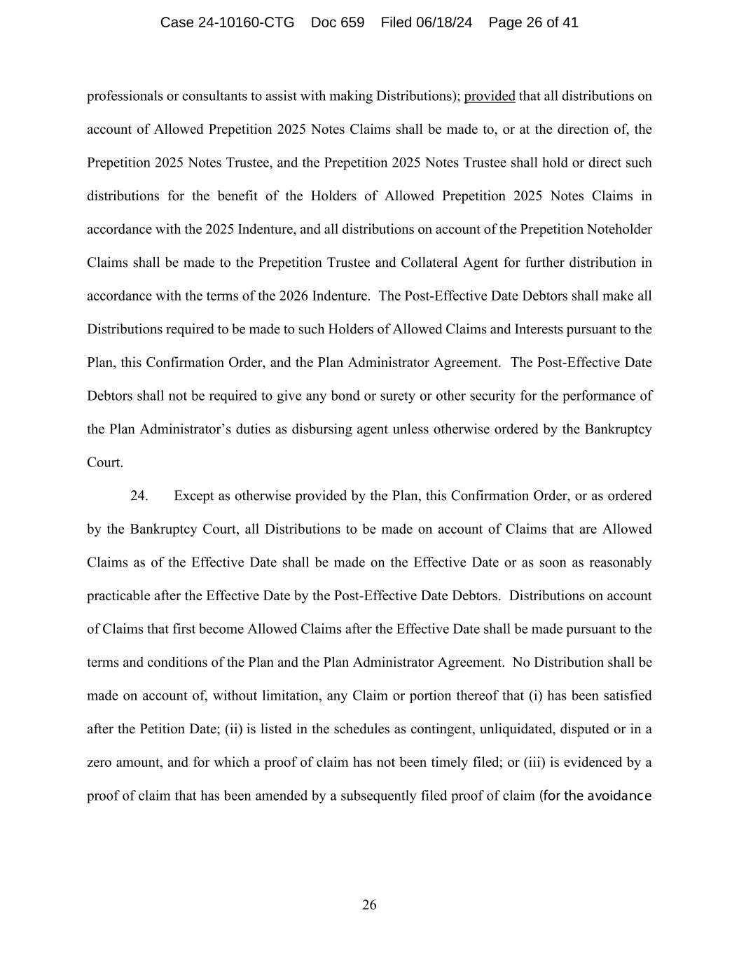 26 professionals or consultants to assist with making Distributions); provided that all distributions on account of Allowed Prepetition 2025 Notes Claims shall be made to, or at the direction of, the Prepetition 2025 Notes Trustee, and the Prepetition 2025 Notes Trustee shall hold or direct such distributions for the benefit of the Holders of Allowed Prepetition 2025 Notes Claims in accordance with the 2025 Indenture, and all distributions on account of the Prepetition Noteholder Claims shall be made to the Prepetition Trustee and Collateral Agent for further distribution in accordance with the terms of the 2026 Indenture. The Post-Effective Date Debtors shall make all Distributions required to be made to such Holders of Allowed Claims and Interests pursuant to the Plan, this Confirmation Order, and the Plan Administrator Agreement. The Post-Effective Date Debtors shall not be required to give any bond or surety or other security for the performance of the Plan Administrator’s duties as disbursing agent unless otherwise ordered by the Bankruptcy Court. 24. Except as otherwise provided by the Plan, this Confirmation Order, or as ordered by the Bankruptcy Court, all Distributions to be made on account of Claims that are Allowed Claims as of the Effective Date shall be made on the Effective Date or as soon as reasonably practicable after the Effective Date by the Post-Effective Date Debtors. Distributions on account of Claims that first become Allowed Claims after the Effective Date shall be made pursuant to the terms and conditions of the Plan and the Plan Administrator Agreement. No Distribution shall be made on account of, without limitation, any Claim or portion thereof that (i) has been satisfied after the Petition Date; (ii) is listed in the schedules as contingent, unliquidated, disputed or in a zero amount, and for which a proof of claim has not been timely filed; or (iii) is evidenced by a proof of claim that has been amended by a subsequently filed proof of claim (for the avoidance Case 24-10160-CTG Doc 659 Filed 06/18/24 Page 26 of 41