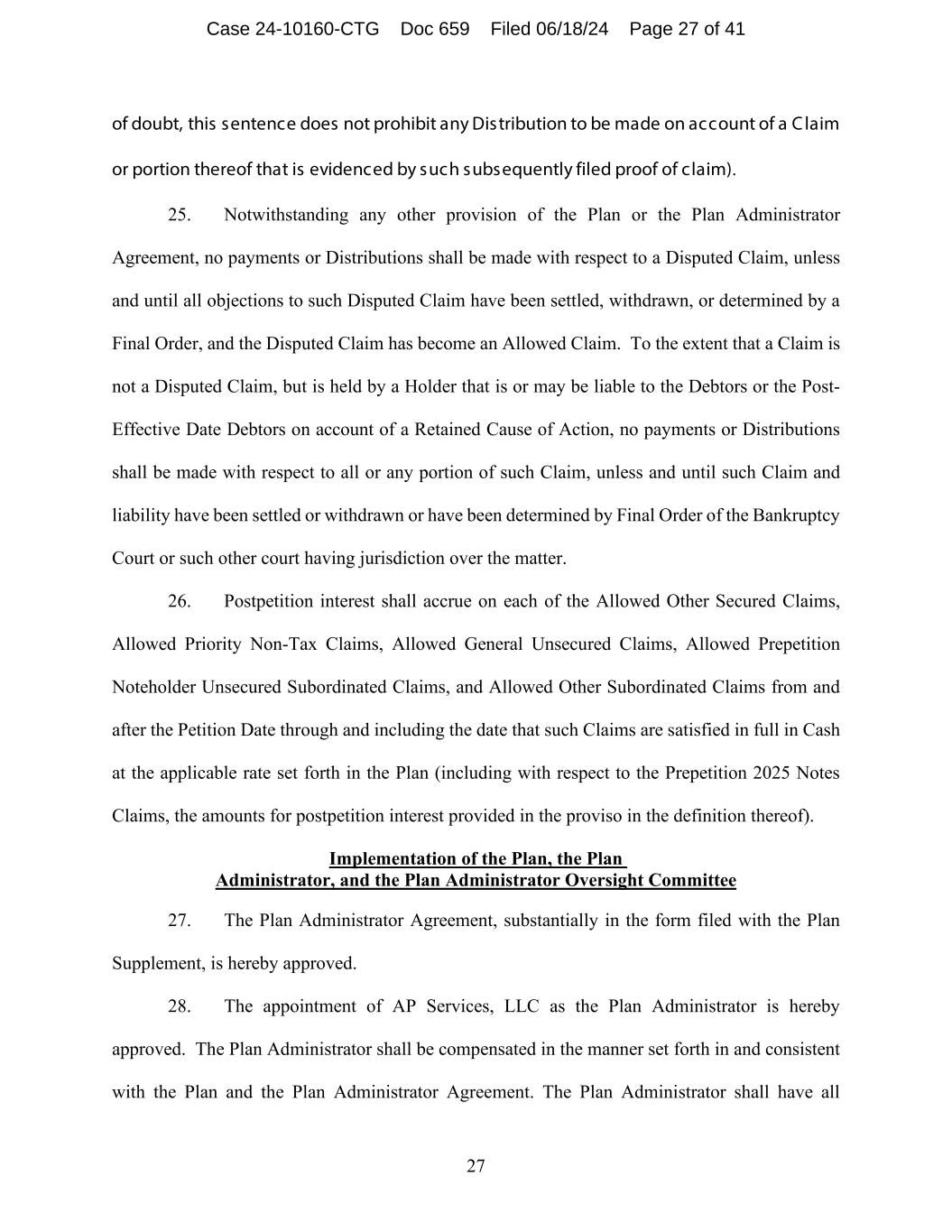 27 of doubt, this sentence does not prohibit any Distribution to be made on account of a C laim or portion thereof that is evidenced by such subsequently filed proof of claim). 25. Notwithstanding any other provision of the Plan or the Plan Administrator Agreement, no payments or Distributions shall be made with respect to a Disputed Claim, unless and until all objections to such Disputed Claim have been settled, withdrawn, or determined by a Final Order, and the Disputed Claim has become an Allowed Claim. To the extent that a Claim is not a Disputed Claim, but is held by a Holder that is or may be liable to the Debtors or the Post- Effective Date Debtors on account of a Retained Cause of Action, no payments or Distributions shall be made with respect to all or any portion of such Claim, unless and until such Claim and liability have been settled or withdrawn or have been determined by Final Order of the Bankruptcy Court or such other court having jurisdiction over the matter. 26. Postpetition interest shall accrue on each of the Allowed Other Secured Claims, Allowed Priority Non-Tax Claims, Allowed General Unsecured Claims, Allowed Prepetition Noteholder Unsecured Subordinated Claims, and Allowed Other Subordinated Claims from and after the Petition Date through and including the date that such Claims are satisfied in full in Cash at the applicable rate set forth in the Plan (including with respect to the Prepetition 2025 Notes Claims, the amounts for postpetition interest provided in the proviso in the definition thereof). Implementation of the Plan, the Plan Administrator, and the Plan Administrator Oversight Committee 27. The Plan Administrator Agreement, substantially in the form filed with the Plan Supplement, is hereby approved. 28. The appointment of AP Services, LLC as the Plan Administrator is hereby approved. The Plan Administrator shall be compensated in the manner set forth in and consistent with the Plan and the Plan Administrator Agreement. The Plan Administrator shall have all Case 24-10160-CTG Doc 659 Filed 06/18/24 Page 27 of 41