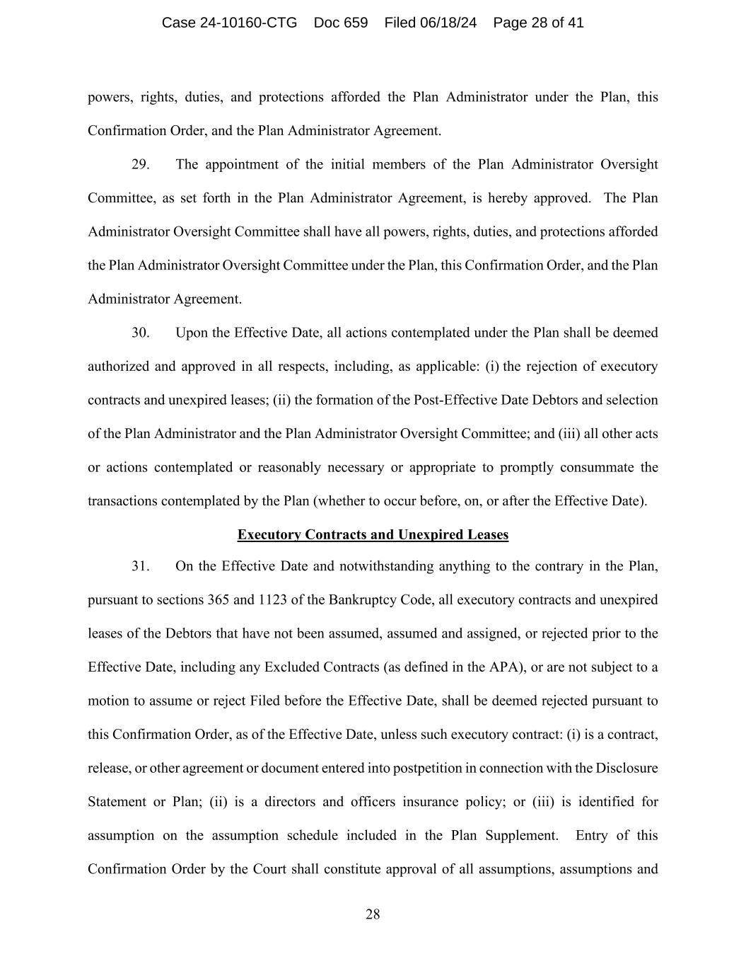 28 powers, rights, duties, and protections afforded the Plan Administrator under the Plan, this Confirmation Order, and the Plan Administrator Agreement. 29. The appointment of the initial members of the Plan Administrator Oversight Committee, as set forth in the Plan Administrator Agreement, is hereby approved. The Plan Administrator Oversight Committee shall have all powers, rights, duties, and protections afforded the Plan Administrator Oversight Committee under the Plan, this Confirmation Order, and the Plan Administrator Agreement. 30. Upon the Effective Date, all actions contemplated under the Plan shall be deemed authorized and approved in all respects, including, as applicable: (i) the rejection of executory contracts and unexpired leases; (ii) the formation of the Post-Effective Date Debtors and selection of the Plan Administrator and the Plan Administrator Oversight Committee; and (iii) all other acts or actions contemplated or reasonably necessary or appropriate to promptly consummate the transactions contemplated by the Plan (whether to occur before, on, or after the Effective Date). Executory Contracts and Unexpired Leases 31. On the Effective Date and notwithstanding anything to the contrary in the Plan, pursuant to sections 365 and 1123 of the Bankruptcy Code, all executory contracts and unexpired leases of the Debtors that have not been assumed, assumed and assigned, or rejected prior to the Effective Date, including any Excluded Contracts (as defined in the APA), or are not subject to a motion to assume or reject Filed before the Effective Date, shall be deemed rejected pursuant to this Confirmation Order, as of the Effective Date, unless such executory contract: (i) is a contract, release, or other agreement or document entered into postpetition in connection with the Disclosure Statement or Plan; (ii) is a directors and officers insurance policy; or (iii) is identified for assumption on the assumption schedule included in the Plan Supplement. Entry of this Confirmation Order by the Court shall constitute approval of all assumptions, assumptions and Case 24-10160-CTG Doc 659 Filed 06/18/24 Page 28 of 41