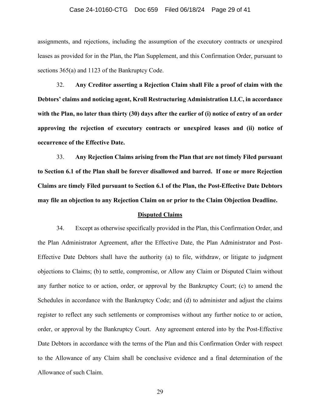 29 assignments, and rejections, including the assumption of the executory contracts or unexpired leases as provided for in the Plan, the Plan Supplement, and this Confirmation Order, pursuant to sections 365(a) and 1123 of the Bankruptcy Code. 32. Any Creditor asserting a Rejection Claim shall File a proof of claim with the Debtors’ claims and noticing agent, Kroll Restructuring Administration LLC, in accordance with the Plan, no later than thirty (30) days after the earlier of (i) notice of entry of an order approving the rejection of executory contracts or unexpired leases and (ii) notice of occurrence of the Effective Date. 33. Any Rejection Claims arising from the Plan that are not timely Filed pursuant to Section 6.1 of the Plan shall be forever disallowed and barred. If one or more Rejection Claims are timely Filed pursuant to Section 6.1 of the Plan, the Post-Effective Date Debtors may file an objection to any Rejection Claim on or prior to the Claim Objection Deadline. Disputed Claims 34. Except as otherwise specifically provided in the Plan, this Confirmation Order, and the Plan Administrator Agreement, after the Effective Date, the Plan Administrator and Post- Effective Date Debtors shall have the authority (a) to file, withdraw, or litigate to judgment objections to Claims; (b) to settle, compromise, or Allow any Claim or Disputed Claim without any further notice to or action, order, or approval by the Bankruptcy Court; (c) to amend the Schedules in accordance with the Bankruptcy Code; and (d) to administer and adjust the claims register to reflect any such settlements or compromises without any further notice to or action, order, or approval by the Bankruptcy Court. Any agreement entered into by the Post-Effective Date Debtors in accordance with the terms of the Plan and this Confirmation Order with respect to the Allowance of any Claim shall be conclusive evidence and a final determination of the Allowance of such Claim. Case 24-10160-CTG Doc 659 Filed 06/18/24 Page 29 of 41