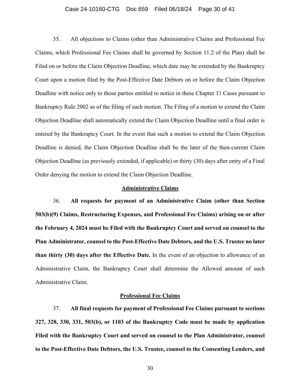 30 35. All objections to Claims (other than Administrative Claims and Professional Fee Claims, which Professional Fee Claims shall be governed by Section 11.2 of the Plan) shall be Filed on or before the Claim Objection Deadline, which date may be extended by the Bankruptcy Court upon a motion filed by the Post-Effective Date Debtors on or before the Claim Objection Deadline with notice only to those parties entitled to notice in these Chapter 11 Cases pursuant to Bankruptcy Rule 2002 as of the filing of such motion. The Filing of a motion to extend the Claim Objection Deadline shall automatically extend the Claim Objection Deadline until a final order is entered by the Bankruptcy Court. In the event that such a motion to extend the Claim Objection Deadline is denied, the Claim Objection Deadline shall be the later of the then-current Claim Objection Deadline (as previously extended, if applicable) or thirty (30) days after entry of a Final Order denying the motion to extend the Claim Objection Deadline. Administrative Claims 36. All requests for payment of an Administrative Claim (other than Section 503(b)(9) Claims, Restructuring Expenses, and Professional Fee Claims) arising on or after the February 4, 2024 must be Filed with the Bankruptcy Court and served on counsel to the Plan Administrator, counsel to the Post-Effective Date Debtors, and the U.S. Trustee no later than thirty (30) days after the Effective Date. In the event of an objection to allowance of an Administrative Claim, the Bankruptcy Court shall determine the Allowed amount of such Administrative Claim. Professional Fee Claims 37. All final requests for payment of Professional Fee Claims pursuant to sections 327, 328, 330, 331, 503(b), or 1103 of the Bankruptcy Code must be made by application Filed with the Bankruptcy Court and served on counsel to the Plan Administrator, counsel to the Post-Effective Date Debtors, the U.S. Trustee, counsel to the Consenting Lenders, and Case 24-10160-CTG Doc 659 Filed 06/18/24 Page 30 of 41