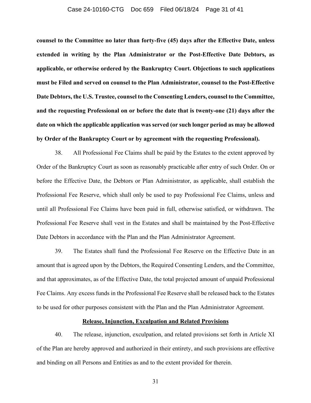 31 counsel to the Committee no later than forty-five (45) days after the Effective Date, unless extended in writing by the Plan Administrator or the Post-Effective Date Debtors, as applicable, or otherwise ordered by the Bankruptcy Court. Objections to such applications must be Filed and served on counsel to the Plan Administrator, counsel to the Post-Effective Date Debtors, the U.S. Trustee, counsel to the Consenting Lenders, counsel to the Committee, and the requesting Professional on or before the date that is twenty-one (21) days after the date on which the applicable application was served (or such longer period as may be allowed by Order of the Bankruptcy Court or by agreement with the requesting Professional). 38. All Professional Fee Claims shall be paid by the Estates to the extent approved by Order of the Bankruptcy Court as soon as reasonably practicable after entry of such Order. On or before the Effective Date, the Debtors or Plan Administrator, as applicable, shall establish the Professional Fee Reserve, which shall only be used to pay Professional Fee Claims, unless and until all Professional Fee Claims have been paid in full, otherwise satisfied, or withdrawn. The Professional Fee Reserve shall vest in the Estates and shall be maintained by the Post-Effective Date Debtors in accordance with the Plan and the Plan Administrator Agreement. 39. The Estates shall fund the Professional Fee Reserve on the Effective Date in an amount that is agreed upon by the Debtors, the Required Consenting Lenders, and the Committee, and that approximates, as of the Effective Date, the total projected amount of unpaid Professional Fee Claims. Any excess funds in the Professional Fee Reserve shall be released back to the Estates to be used for other purposes consistent with the Plan and the Plan Administrator Agreement. Release, Injunction, Exculpation and Related Provisions 40. The release, injunction, exculpation, and related provisions set forth in Article XI of the Plan are hereby approved and authorized in their entirety, and such provisions are effective and binding on all Persons and Entities as and to the extent provided for therein. Case 24-10160-CTG Doc 659 Filed 06/18/24 Page 31 of 41
