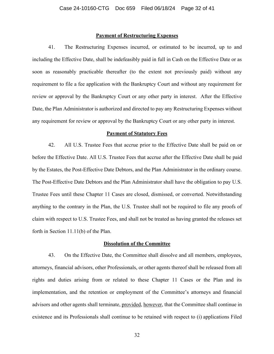 32 Payment of Restructuring Expenses 41. The Restructuring Expenses incurred, or estimated to be incurred, up to and including the Effective Date, shall be indefeasibly paid in full in Cash on the Effective Date or as soon as reasonably practicable thereafter (to the extent not previously paid) without any requirement to file a fee application with the Bankruptcy Court and without any requirement for review or approval by the Bankruptcy Court or any other party in interest. After the Effective Date, the Plan Administrator is authorized and directed to pay any Restructuring Expenses without any requirement for review or approval by the Bankruptcy Court or any other party in interest. Payment of Statutory Fees 42. All U.S. Trustee Fees that accrue prior to the Effective Date shall be paid on or before the Effective Date. All U.S. Trustee Fees that accrue after the Effective Date shall be paid by the Estates, the Post-Effective Date Debtors, and the Plan Administrator in the ordinary course. The Post-Effective Date Debtors and the Plan Administrator shall have the obligation to pay U.S. Trustee Fees until these Chapter 11 Cases are closed, dismissed, or converted. Notwithstanding anything to the contrary in the Plan, the U.S. Trustee shall not be required to file any proofs of claim with respect to U.S. Trustee Fees, and shall not be treated as having granted the releases set forth in Section 11.11(b) of the Plan. Dissolution of the Committee 43. On the Effective Date, the Committee shall dissolve and all members, employees, attorneys, financial advisors, other Professionals, or other agents thereof shall be released from all rights and duties arising from or related to these Chapter 11 Cases or the Plan and its implementation, and the retention or employment of the Committee’s attorneys and financial advisors and other agents shall terminate, provided, however, that the Committee shall continue in existence and its Professionals shall continue to be retained with respect to (i) applications Filed Case 24-10160-CTG Doc 659 Filed 06/18/24 Page 32 of 41
