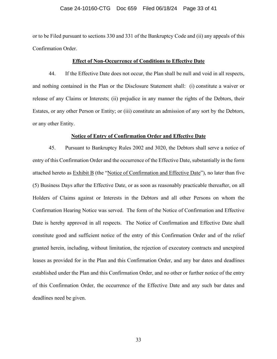33 or to be Filed pursuant to sections 330 and 331 of the Bankruptcy Code and (ii) any appeals of this Confirmation Order. Effect of Non-Occurrence of Conditions to Effective Date 44. If the Effective Date does not occur, the Plan shall be null and void in all respects, and nothing contained in the Plan or the Disclosure Statement shall: (i) constitute a waiver or release of any Claims or Interests; (ii) prejudice in any manner the rights of the Debtors, their Estates, or any other Person or Entity; or (iii) constitute an admission of any sort by the Debtors, or any other Entity. Notice of Entry of Confirmation Order and Effective Date 45. Pursuant to Bankruptcy Rules 2002 and 3020, the Debtors shall serve a notice of entry of this Confirmation Order and the occurrence of the Effective Date, substantially in the form attached hereto as Exhibit B (the “Notice of Confirmation and Effective Date”), no later than five (5) Business Days after the Effective Date, or as soon as reasonably practicable thereafter, on all Holders of Claims against or Interests in the Debtors and all other Persons on whom the Confirmation Hearing Notice was served. The form of the Notice of Confirmation and Effective Date is hereby approved in all respects. The Notice of Confirmation and Effective Date shall constitute good and sufficient notice of the entry of this Confirmation Order and of the relief granted herein, including, without limitation, the rejection of executory contracts and unexpired leases as provided for in the Plan and this Confirmation Order, and any bar dates and deadlines established under the Plan and this Confirmation Order, and no other or further notice of the entry of this Confirmation Order, the occurrence of the Effective Date and any such bar dates and deadlines need be given. Case 24-10160-CTG Doc 659 Filed 06/18/24 Page 33 of 41