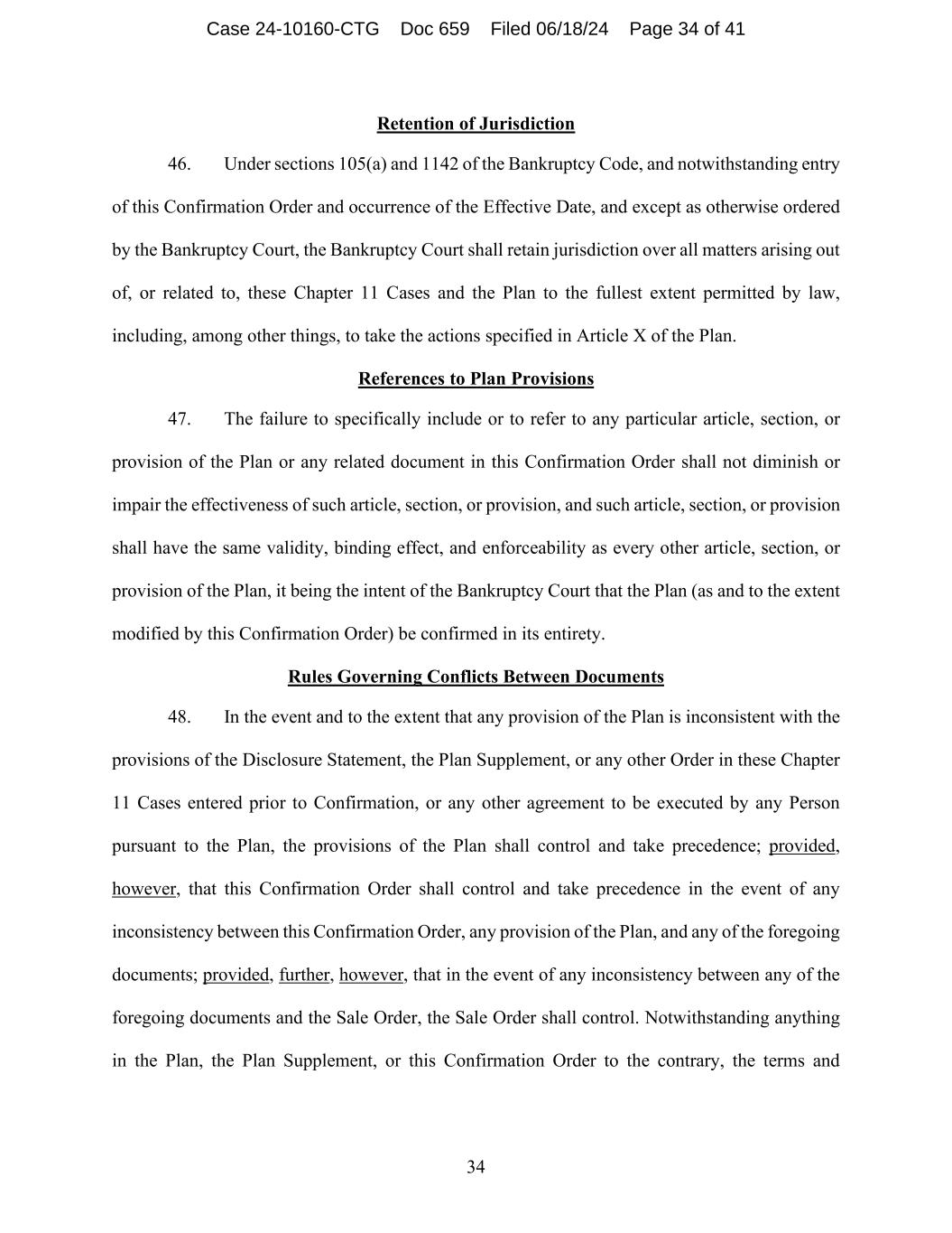 34 Retention of Jurisdiction 46. Under sections 105(a) and 1142 of the Bankruptcy Code, and notwithstanding entry of this Confirmation Order and occurrence of the Effective Date, and except as otherwise ordered by the Bankruptcy Court, the Bankruptcy Court shall retain jurisdiction over all matters arising out of, or related to, these Chapter 11 Cases and the Plan to the fullest extent permitted by law, including, among other things, to take the actions specified in Article X of the Plan. References to Plan Provisions 47. The failure to specifically include or to refer to any particular article, section, or provision of the Plan or any related document in this Confirmation Order shall not diminish or impair the effectiveness of such article, section, or provision, and such article, section, or provision shall have the same validity, binding effect, and enforceability as every other article, section, or provision of the Plan, it being the intent of the Bankruptcy Court that the Plan (as and to the extent modified by this Confirmation Order) be confirmed in its entirety. Rules Governing Conflicts Between Documents 48. In the event and to the extent that any provision of the Plan is inconsistent with the provisions of the Disclosure Statement, the Plan Supplement, or any other Order in these Chapter 11 Cases entered prior to Confirmation, or any other agreement to be executed by any Person pursuant to the Plan, the provisions of the Plan shall control and take precedence; provided, however, that this Confirmation Order shall control and take precedence in the event of any inconsistency between this Confirmation Order, any provision of the Plan, and any of the foregoing documents; provided, further, however, that in the event of any inconsistency between any of the foregoing documents and the Sale Order, the Sale Order shall control. Notwithstanding anything in the Plan, the Plan Supplement, or this Confirmation Order to the contrary, the terms and Case 24-10160-CTG Doc 659 Filed 06/18/24 Page 34 of 41