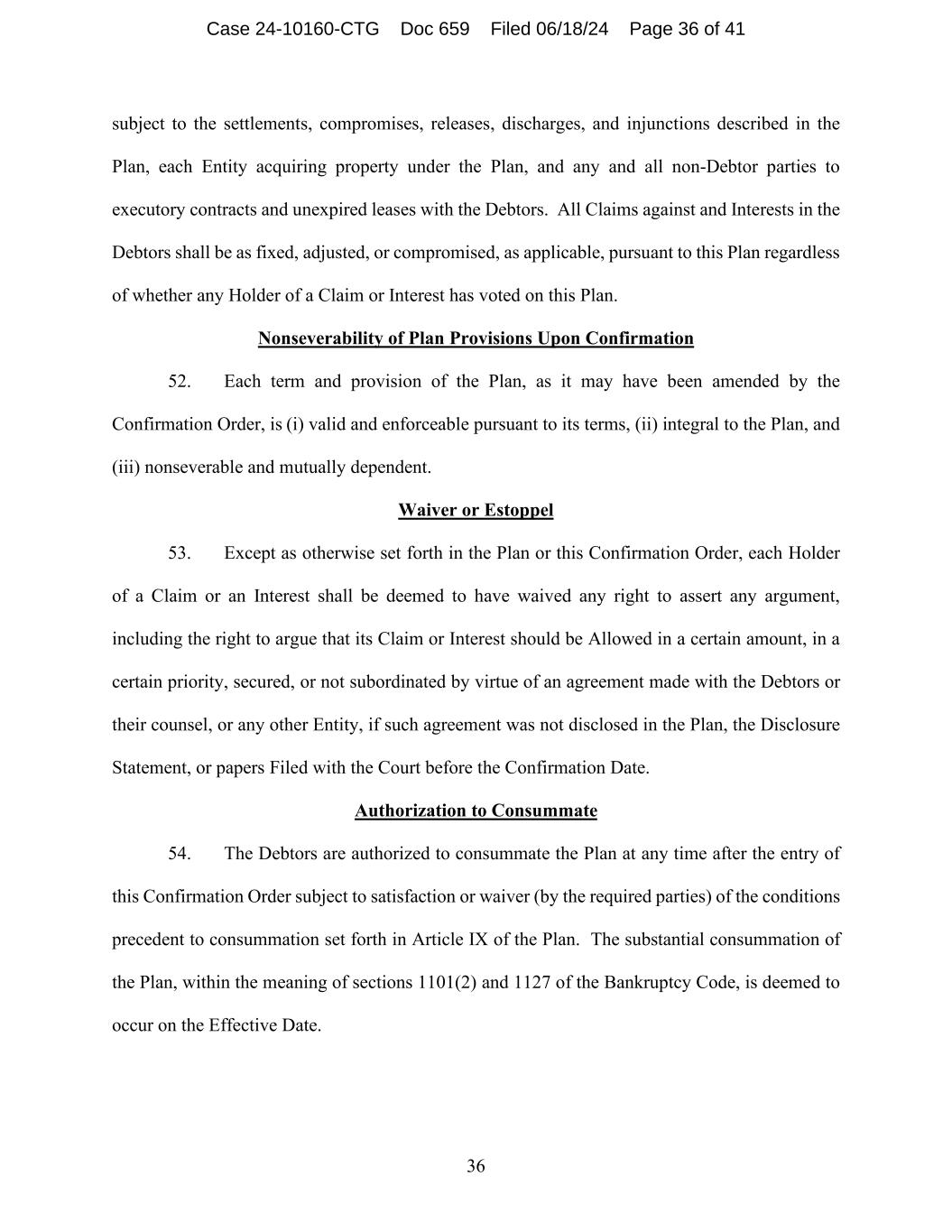 36 subject to the settlements, compromises, releases, discharges, and injunctions described in the Plan, each Entity acquiring property under the Plan, and any and all non-Debtor parties to executory contracts and unexpired leases with the Debtors. All Claims against and Interests in the Debtors shall be as fixed, adjusted, or compromised, as applicable, pursuant to this Plan regardless of whether any Holder of a Claim or Interest has voted on this Plan. Nonseverability of Plan Provisions Upon Confirmation 52. Each term and provision of the Plan, as it may have been amended by the Confirmation Order, is (i) valid and enforceable pursuant to its terms, (ii) integral to the Plan, and (iii) nonseverable and mutually dependent. Waiver or Estoppel 53. Except as otherwise set forth in the Plan or this Confirmation Order, each Holder of a Claim or an Interest shall be deemed to have waived any right to assert any argument, including the right to argue that its Claim or Interest should be Allowed in a certain amount, in a certain priority, secured, or not subordinated by virtue of an agreement made with the Debtors or their counsel, or any other Entity, if such agreement was not disclosed in the Plan, the Disclosure Statement, or papers Filed with the Court before the Confirmation Date. Authorization to Consummate 54. The Debtors are authorized to consummate the Plan at any time after the entry of this Confirmation Order subject to satisfaction or waiver (by the required parties) of the conditions precedent to consummation set forth in Article IX of the Plan. The substantial consummation of the Plan, within the meaning of sections 1101(2) and 1127 of the Bankruptcy Code, is deemed to occur on the Effective Date. Case 24-10160-CTG Doc 659 Filed 06/18/24 Page 36 of 41