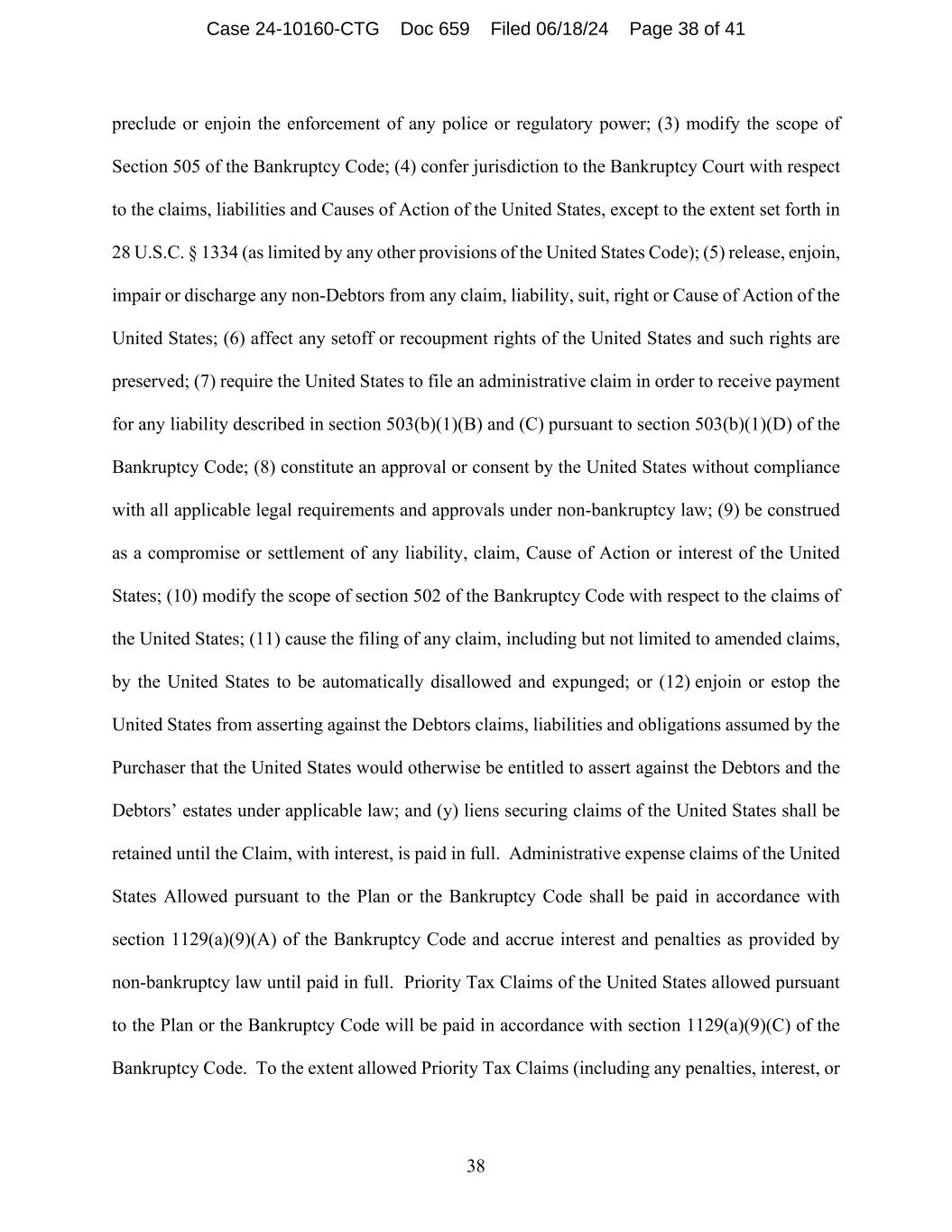 38 preclude or enjoin the enforcement of any police or regulatory power; (3) modify the scope of Section 505 of the Bankruptcy Code; (4) confer jurisdiction to the Bankruptcy Court with respect to the claims, liabilities and Causes of Action of the United States, except to the extent set forth in 28 U.S.C. § 1334 (as limited by any other provisions of the United States Code); (5) release, enjoin, impair or discharge any non-Debtors from any claim, liability, suit, right or Cause of Action of the United States; (6) affect any setoff or recoupment rights of the United States and such rights are preserved; (7) require the United States to file an administrative claim in order to receive payment for any liability described in section 503(b)(1)(B) and (C) pursuant to section 503(b)(1)(D) of the Bankruptcy Code; (8) constitute an approval or consent by the United States without compliance with all applicable legal requirements and approvals under non-bankruptcy law; (9) be construed as a compromise or settlement of any liability, claim, Cause of Action or interest of the United States; (10) modify the scope of section 502 of the Bankruptcy Code with respect to the claims of the United States; (11) cause the filing of any claim, including but not limited to amended claims, by the United States to be automatically disallowed and expunged; or (12) enjoin or estop the United States from asserting against the Debtors claims, liabilities and obligations assumed by the Purchaser that the United States would otherwise be entitled to assert against the Debtors and the Debtors’ estates under applicable law; and (y) liens securing claims of the United States shall be retained until the Claim, with interest, is paid in full. Administrative expense claims of the United States Allowed pursuant to the Plan or the Bankruptcy Code shall be paid in accordance with section 1129(a)(9)(A) of the Bankruptcy Code and accrue interest and penalties as provided by non-bankruptcy law until paid in full. Priority Tax Claims of the United States allowed pursuant to the Plan or the Bankruptcy Code will be paid in accordance with section 1129(a)(9)(C) of the Bankruptcy Code. To the extent allowed Priority Tax Claims (including any penalties, interest, or Case 24-10160-CTG Doc 659 Filed 06/18/24 Page 38 of 41
