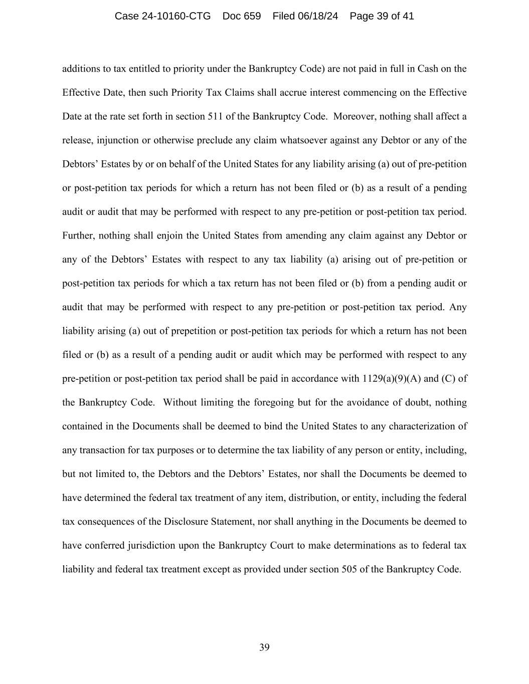 39 additions to tax entitled to priority under the Bankruptcy Code) are not paid in full in Cash on the Effective Date, then such Priority Tax Claims shall accrue interest commencing on the Effective Date at the rate set forth in section 511 of the Bankruptcy Code. Moreover, nothing shall affect a release, injunction or otherwise preclude any claim whatsoever against any Debtor or any of the Debtors’ Estates by or on behalf of the United States for any liability arising (a) out of pre-petition or post-petition tax periods for which a return has not been filed or (b) as a result of a pending audit or audit that may be performed with respect to any pre-petition or post-petition tax period. Further, nothing shall enjoin the United States from amending any claim against any Debtor or any of the Debtors’ Estates with respect to any tax liability (a) arising out of pre-petition or post-petition tax periods for which a tax return has not been filed or (b) from a pending audit or audit that may be performed with respect to any pre-petition or post-petition tax period. Any liability arising (a) out of prepetition or post-petition tax periods for which a return has not been filed or (b) as a result of a pending audit or audit which may be performed with respect to any pre-petition or post-petition tax period shall be paid in accordance with 1129(a)(9)(A) and (C) of the Bankruptcy Code. Without limiting the foregoing but for the avoidance of doubt, nothing contained in the Documents shall be deemed to bind the United States to any characterization of any transaction for tax purposes or to determine the tax liability of any person or entity, including, but not limited to, the Debtors and the Debtors’ Estates, nor shall the Documents be deemed to have determined the federal tax treatment of any item, distribution, or entity, including the federal tax consequences of the Disclosure Statement, nor shall anything in the Documents be deemed to have conferred jurisdiction upon the Bankruptcy Court to make determinations as to federal tax liability and federal tax treatment except as provided under section 505 of the Bankruptcy Code. Case 24-10160-CTG Doc 659 Filed 06/18/24 Page 39 of 41