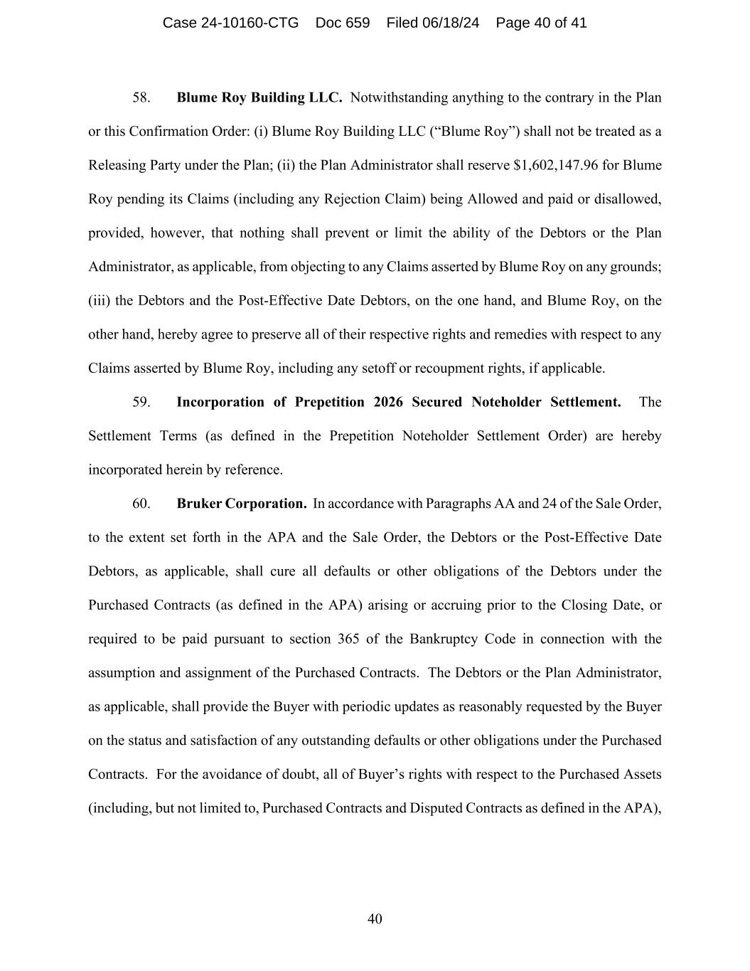 40 58. Blume Roy Building LLC. Notwithstanding anything to the contrary in the Plan or this Confirmation Order: (i) Blume Roy Building LLC (“Blume Roy”) shall not be treated as a Releasing Party under the Plan; (ii) the Plan Administrator shall reserve $1,602,147.96 for Blume Roy pending its Claims (including any Rejection Claim) being Allowed and paid or disallowed, provided, however, that nothing shall prevent or limit the ability of the Debtors or the Plan Administrator, as applicable, from objecting to any Claims asserted by Blume Roy on any grounds; (iii) the Debtors and the Post-Effective Date Debtors, on the one hand, and Blume Roy, on the other hand, hereby agree to preserve all of their respective rights and remedies with respect to any Claims asserted by Blume Roy, including any setoff or recoupment rights, if applicable. 59. Incorporation of Prepetition 2026 Secured Noteholder Settlement. The Settlement Terms (as defined in the Prepetition Noteholder Settlement Order) are hereby incorporated herein by reference. 60. Bruker Corporation. In accordance with Paragraphs AA and 24 of the Sale Order, to the extent set forth in the APA and the Sale Order, the Debtors or the Post-Effective Date Debtors, as applicable, shall cure all defaults or other obligations of the Debtors under the Purchased Contracts (as defined in the APA) arising or accruing prior to the Closing Date, or required to be paid pursuant to section 365 of the Bankruptcy Code in connection with the assumption and assignment of the Purchased Contracts. The Debtors or the Plan Administrator, as applicable, shall provide the Buyer with periodic updates as reasonably requested by the Buyer on the status and satisfaction of any outstanding defaults or other obligations under the Purchased Contracts. For the avoidance of doubt, all of Buyer’s rights with respect to the Purchased Assets (including, but not limited to, Purchased Contracts and Disputed Contracts as defined in the APA), Case 24-10160-CTG Doc 659 Filed 06/18/24 Page 40 of 41