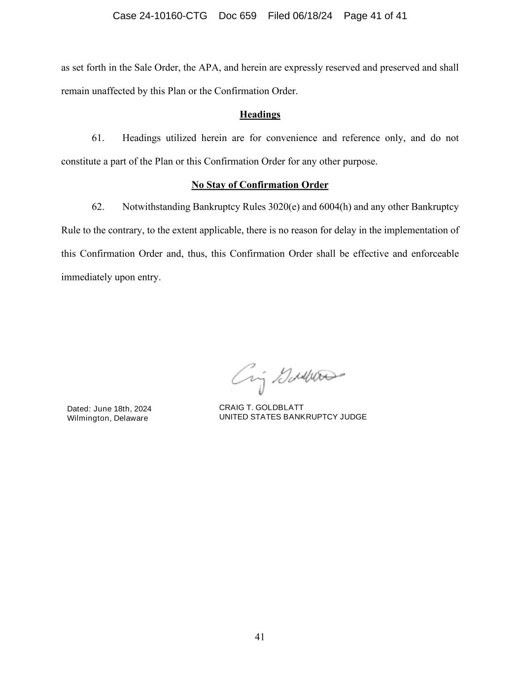 41 as set forth in the Sale Order, the APA, and herein are expressly reserved and preserved and shall remain unaffected by this Plan or the Confirmation Order. Headings 61. Headings utilized herein are for convenience and reference only, and do not constitute a part of the Plan or this Confirmation Order for any other purpose. No Stay of Confirmation Order 62. Notwithstanding Bankruptcy Rules 3020(e) and 6004(h) and any other Bankruptcy Rule to the contrary, to the extent applicable, there is no reason for delay in the implementation of this Confirmation Order and, thus, this Confirmation Order shall be effective and enforceable immediately upon entry. Dated: June 18th, 2024 Wilmington, Delaware CRAIG T. GOLDBLATT UNITED STATES BANKRUPTCY JUDGE Case 24-10160-CTG Doc 659 Filed 06/18/24 Page 41 of 41