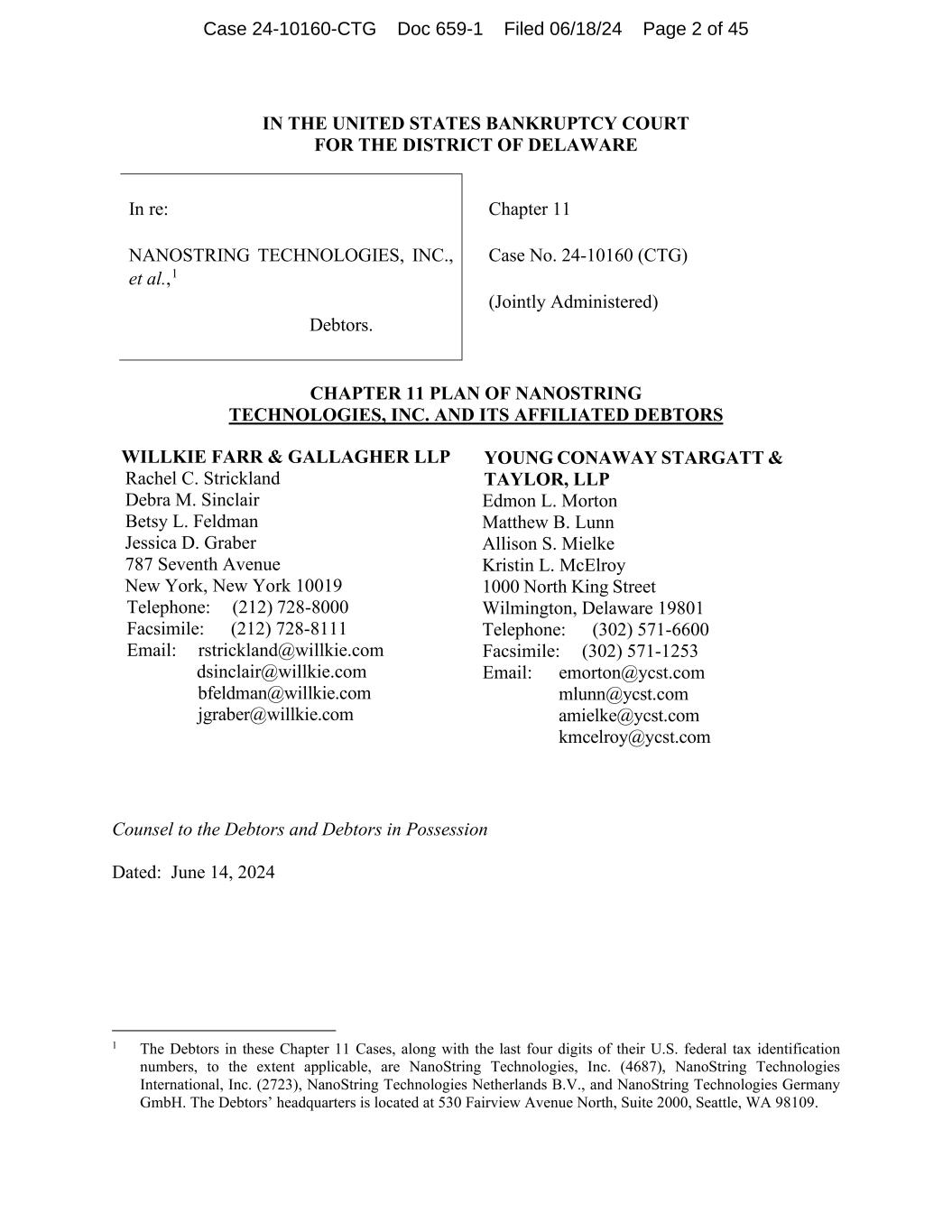 IN THE UNITED STATES BANKRUPTCY COURT FOR THE DISTRICT OF DELAWARE In re: NANOSTRING TECHNOLOGIES, INC., et al.,1 Debtors. Chapter 11 Case No. 24-10160 (CTG) (Jointly Administered) CHAPTER 11 PLAN OF NANOSTRING TECHNOLOGIES, INC. AND ITS AFFILIATED DEBTORS WILLKIE FARR & GALLAGHER LLP Rachel C. Strickland Debra M. Sinclair Betsy L. Feldman Jessica D. Graber 787 Seventh Avenue New York, New York 10019 Telephone: (212) 728-8000 Facsimile: (212) 728-8111 Email: rstrickland@willkie.com dsinclair@willkie.com bfeldman@willkie.com jgraber@willkie.com YOUNG CONAWAY STARGATT & TAYLOR, LLP Edmon L. Morton Matthew B. Lunn Allison S. Mielke Kristin L. McElroy 1000 North King Street Wilmington, Delaware 19801 Telephone: (302) 571-6600 Facsimile: (302) 571-1253 Email: emorton@ycst.com mlunn@ycst.com amielke@ycst.com kmcelroy@ycst.com Counsel to the Debtors and Debtors in Possession Dated: June 14, 2024 1 The Debtors in these Chapter 11 Cases, along with the last four digits of their U.S. federal tax identification numbers, to the extent applicable, are NanoString Technologies, Inc. (4687), NanoString Technologies International, Inc. (2723), NanoString Technologies Netherlands B.V., and NanoString Technologies Germany GmbH. The Debtors’ headquarters is located at 530 Fairview Avenue North, Suite 2000, Seattle, WA 98109. Case 24-10160-CTG Doc 659-1 Filed 06/18/24 Page 2 of 45
