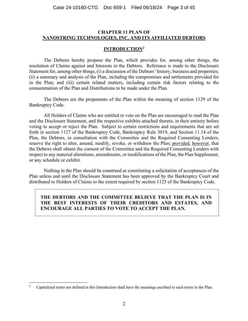 2 CHAPTER 11 PLAN OF NANOSTRING TECHNOLOGIES, INC. AND ITS AFFILIATED DEBTORS INTRODUCTION2 The Debtors hereby propose the Plan, which provides for, among other things, the resolution of Claims against and Interests in the Debtors. Reference is made to the Disclosure Statement for, among other things, (i) a discussion of the Debtors’ history, business and properties; (ii) a summary and analysis of the Plan, including the compromises and settlements provided for in the Plan; and (iii) certain related matters, including certain risk factors relating to the consummation of the Plan and Distributions to be made under the Plan. The Debtors are the proponents of the Plan within the meaning of section 1129 of the Bankruptcy Code. All Holders of Claims who are entitled to vote on the Plan are encouraged to read the Plan and the Disclosure Statement, and the respective exhibits attached thereto, in their entirety before voting to accept or reject the Plan. Subject to certain restrictions and requirements that are set forth in section 1127 of the Bankruptcy Code, Bankruptcy Rule 3019, and Section 11.14 of the Plan, the Debtors, in consultation with the Committee and the Required Consenting Lenders, reserve the right to alter, amend, modify, revoke, or withdraw the Plan; provided, however, that the Debtors shall obtain the consent of the Committee and the Required Consenting Lenders with respect to any material alterations, amendments, or modifications of the Plan, the Plan Supplement, or any schedule or exhibit. Nothing in the Plan should be construed as constituting a solicitation of acceptances of the Plan unless and until the Disclosure Statement has been approved by the Bankruptcy Court and distributed to Holders of Claims to the extent required by section 1125 of the Bankruptcy Code. THE DEBTORS AND THE COMMITTEE BELIEVE THAT THE PLAN IS IN THE BEST INTERESTS OF THEIR CREDITORS AND ESTATES, AND ENCOURAGE ALL PARTIES TO VOTE TO ACCEPT THE PLAN. 2 Capitalized terms not defined in this Introduction shall have the meanings ascribed to such terms in the Plan. Case 24-10160-CTG Doc 659-1 Filed 06/18/24 Page 3 of 45
