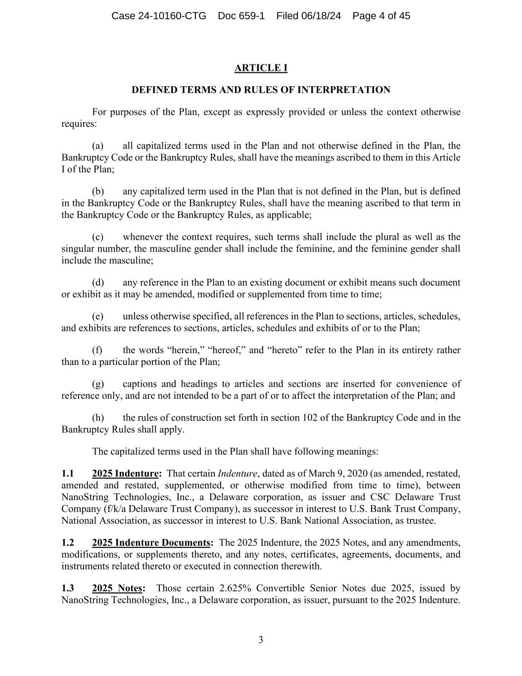 3 ARTICLE I DEFINED TERMS AND RULES OF INTERPRETATION For purposes of the Plan, except as expressly provided or unless the context otherwise requires: (a) all capitalized terms used in the Plan and not otherwise defined in the Plan, the Bankruptcy Code or the Bankruptcy Rules, shall have the meanings ascribed to them in this Article I of the Plan; (b) any capitalized term used in the Plan that is not defined in the Plan, but is defined in the Bankruptcy Code or the Bankruptcy Rules, shall have the meaning ascribed to that term in the Bankruptcy Code or the Bankruptcy Rules, as applicable; (c) whenever the context requires, such terms shall include the plural as well as the singular number, the masculine gender shall include the feminine, and the feminine gender shall include the masculine; (d) any reference in the Plan to an existing document or exhibit means such document or exhibit as it may be amended, modified or supplemented from time to time; (e) unless otherwise specified, all references in the Plan to sections, articles, schedules, and exhibits are references to sections, articles, schedules and exhibits of or to the Plan; (f) the words “herein,” “hereof,” and “hereto” refer to the Plan in its entirety rather than to a particular portion of the Plan; (g) captions and headings to articles and sections are inserted for convenience of reference only, and are not intended to be a part of or to affect the interpretation of the Plan; and (h) the rules of construction set forth in section 102 of the Bankruptcy Code and in the Bankruptcy Rules shall apply. The capitalized terms used in the Plan shall have following meanings: 1.1 2025 Indenture: That certain Indenture, dated as of March 9, 2020 (as amended, restated, amended and restated, supplemented, or otherwise modified from time to time), between NanoString Technologies, Inc., a Delaware corporation, as issuer and CSC Delaware Trust Company (f/k/a Delaware Trust Company), as successor in interest to U.S. Bank Trust Company, National Association, as successor in interest to U.S. Bank National Association, as trustee. 1.2 2025 Indenture Documents: The 2025 Indenture, the 2025 Notes, and any amendments, modifications, or supplements thereto, and any notes, certificates, agreements, documents, and instruments related thereto or executed in connection therewith. 1.3 2025 Notes: Those certain 2.625% Convertible Senior Notes due 2025, issued by NanoString Technologies, Inc., a Delaware corporation, as issuer, pursuant to the 2025 Indenture. Case 24-10160-CTG Doc 659-1 Filed 06/18/24 Page 4 of 45