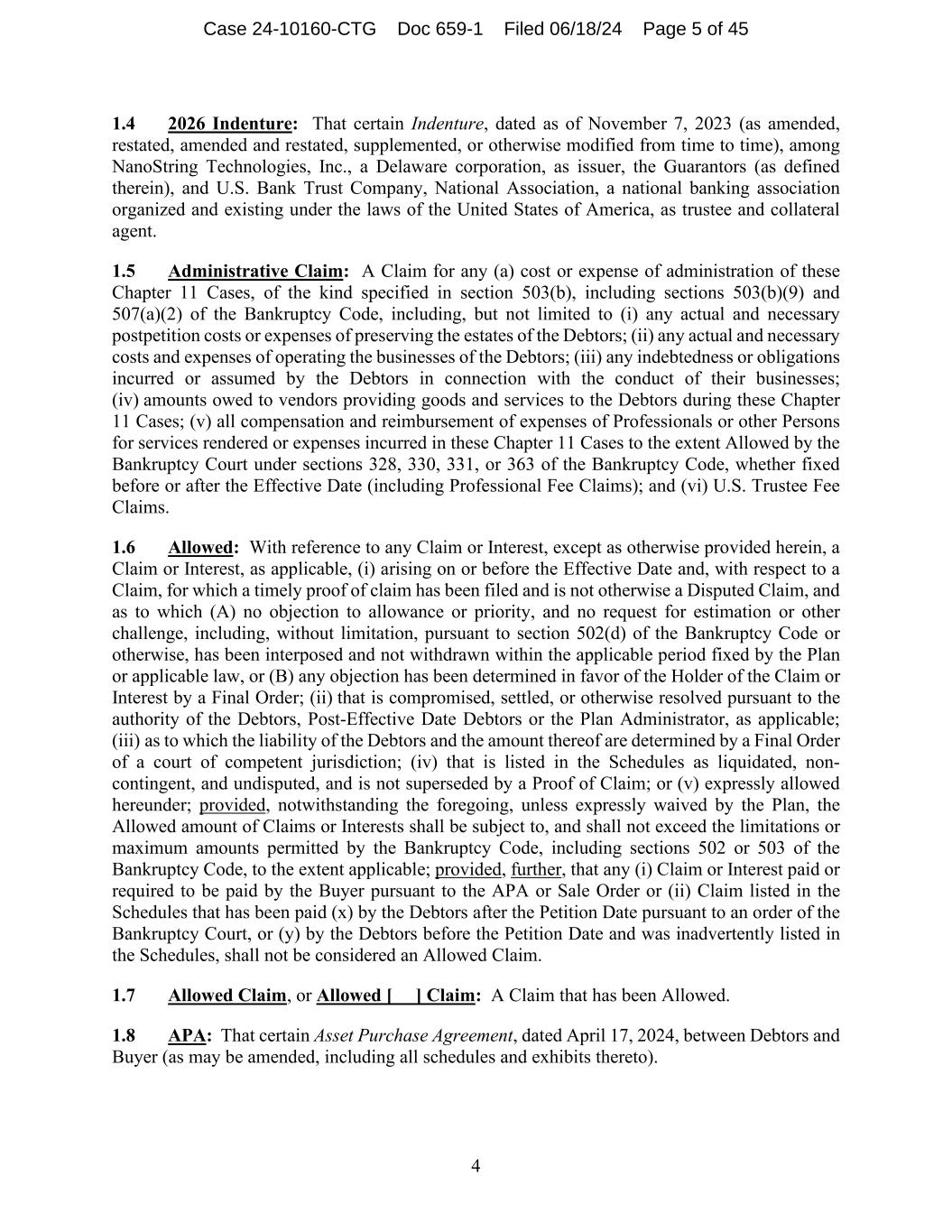 4 1.4 2026 Indenture: That certain Indenture, dated as of November 7, 2023 (as amended, restated, amended and restated, supplemented, or otherwise modified from time to time), among NanoString Technologies, Inc., a Delaware corporation, as issuer, the Guarantors (as defined therein), and U.S. Bank Trust Company, National Association, a national banking association organized and existing under the laws of the United States of America, as trustee and collateral agent. 1.5 Administrative Claim: A Claim for any (a) cost or expense of administration of these Chapter 11 Cases, of the kind specified in section 503(b), including sections 503(b)(9) and 507(a)(2) of the Bankruptcy Code, including, but not limited to (i) any actual and necessary postpetition costs or expenses of preserving the estates of the Debtors; (ii) any actual and necessary costs and expenses of operating the businesses of the Debtors; (iii) any indebtedness or obligations incurred or assumed by the Debtors in connection with the conduct of their businesses; (iv) amounts owed to vendors providing goods and services to the Debtors during these Chapter 11 Cases; (v) all compensation and reimbursement of expenses of Professionals or other Persons for services rendered or expenses incurred in these Chapter 11 Cases to the extent Allowed by the Bankruptcy Court under sections 328, 330, 331, or 363 of the Bankruptcy Code, whether fixed before or after the Effective Date (including Professional Fee Claims); and (vi) U.S. Trustee Fee Claims. 1.6 Allowed: With reference to any Claim or Interest, except as otherwise provided herein, a Claim or Interest, as applicable, (i) arising on or before the Effective Date and, with respect to a Claim, for which a timely proof of claim has been filed and is not otherwise a Disputed Claim, and as to which (A) no objection to allowance or priority, and no request for estimation or other challenge, including, without limitation, pursuant to section 502(d) of the Bankruptcy Code or otherwise, has been interposed and not withdrawn within the applicable period fixed by the Plan or applicable law, or (B) any objection has been determined in favor of the Holder of the Claim or Interest by a Final Order; (ii) that is compromised, settled, or otherwise resolved pursuant to the authority of the Debtors, Post-Effective Date Debtors or the Plan Administrator, as applicable; (iii) as to which the liability of the Debtors and the amount thereof are determined by a Final Order of a court of competent jurisdiction; (iv) that is listed in the Schedules as liquidated, non- contingent, and undisputed, and is not superseded by a Proof of Claim; or (v) expressly allowed hereunder; provided, notwithstanding the foregoing, unless expressly waived by the Plan, the Allowed amount of Claims or Interests shall be subject to, and shall not exceed the limitations or maximum amounts permitted by the Bankruptcy Code, including sections 502 or 503 of the Bankruptcy Code, to the extent applicable; provided, further, that any (i) Claim or Interest paid or required to be paid by the Buyer pursuant to the APA or Sale Order or (ii) Claim listed in the Schedules that has been paid (x) by the Debtors after the Petition Date pursuant to an order of the Bankruptcy Court, or (y) by the Debtors before the Petition Date and was inadvertently listed in the Schedules, shall not be considered an Allowed Claim. 1.7 Allowed Claim, or Allowed [ ] Claim: A Claim that has been Allowed. 1.8 APA: That certain Asset Purchase Agreement, dated April 17, 2024, between Debtors and Buyer (as may be amended, including all schedules and exhibits thereto). Case 24-10160-CTG Doc 659-1 Filed 06/18/24 Page 5 of 45