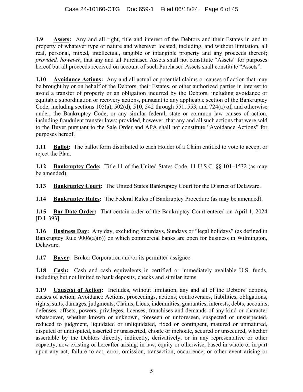 5 1.9 Assets: Any and all right, title and interest of the Debtors and their Estates in and to property of whatever type or nature and wherever located, including, and without limitation, all real, personal, mixed, intellectual, tangible or intangible property and any proceeds thereof; provided, however, that any and all Purchased Assets shall not constitute “Assets” for purposes hereof but all proceeds received on account of such Purchased Assets shall constitute “Assets”. 1.10 Avoidance Actions: Any and all actual or potential claims or causes of action that may be brought by or on behalf of the Debtors, their Estates, or other authorized parties in interest to avoid a transfer of property or an obligation incurred by the Debtors, including avoidance or equitable subordination or recovery actions, pursuant to any applicable section of the Bankruptcy Code, including sections 105(a), 502(d), 510, 542 through 551, 553, and 724(a) of, and otherwise under, the Bankruptcy Code, or any similar federal, state or common law causes of action, including fraudulent transfer laws; provided, however, that any and all such actions that were sold to the Buyer pursuant to the Sale Order and APA shall not constitute “Avoidance Actions” for purposes hereof. 1.11 Ballot: The ballot form distributed to each Holder of a Claim entitled to vote to accept or reject the Plan. 1.12 Bankruptcy Code: Title 11 of the United States Code, 11 U.S.C. §§ 101–1532 (as may be amended). 1.13 Bankruptcy Court: The United States Bankruptcy Court for the District of Delaware. 1.14 Bankruptcy Rules: The Federal Rules of Bankruptcy Procedure (as may be amended). 1.15 Bar Date Order: That certain order of the Bankruptcy Court entered on April 1, 2024 [D.I. 393]. 1.16 Business Day: Any day, excluding Saturdays, Sundays or “legal holidays” (as defined in Bankruptcy Rule 9006(a)(6)) on which commercial banks are open for business in Wilmington, Delaware. 1.17 Buyer: Bruker Corporation and/or its permitted assignee. 1.18 Cash: Cash and cash equivalents in certified or immediately available U.S. funds, including but not limited to bank deposits, checks and similar items. 1.19 Cause(s) of Action: Includes, without limitation, any and all of the Debtors’ actions, causes of action, Avoidance Actions, proceedings, actions, controversies, liabilities, obligations, rights, suits, damages, judgments, Claims, Liens, indemnities, guaranties, interests, debts, accounts, defenses, offsets, powers, privileges, licenses, franchises and demands of any kind or character whatsoever, whether known or unknown, foreseen or unforeseen, suspected or unsuspected, reduced to judgment, liquidated or unliquidated, fixed or contingent, matured or unmatured, disputed or undisputed, asserted or unasserted, choate or inchoate, secured or unsecured, whether assertable by the Debtors directly, indirectly, derivatively, or in any representative or other capacity, now existing or hereafter arising, in law, equity or otherwise, based in whole or in part upon any act, failure to act, error, omission, transaction, occurrence, or other event arising or Case 24-10160-CTG Doc 659-1 Filed 06/18/24 Page 6 of 45