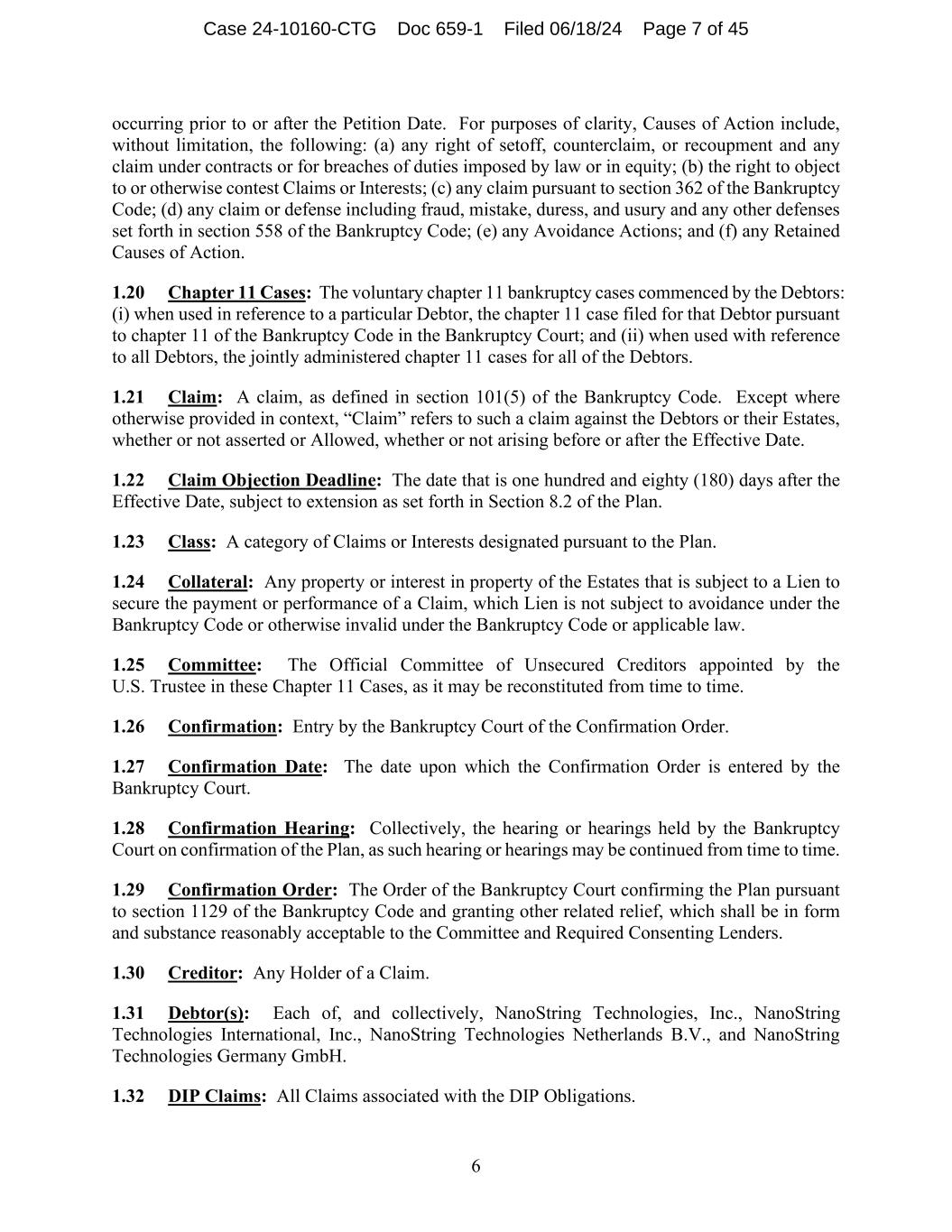 6 occurring prior to or after the Petition Date. For purposes of clarity, Causes of Action include, without limitation, the following: (a) any right of setoff, counterclaim, or recoupment and any claim under contracts or for breaches of duties imposed by law or in equity; (b) the right to object to or otherwise contest Claims or Interests; (c) any claim pursuant to section 362 of the Bankruptcy Code; (d) any claim or defense including fraud, mistake, duress, and usury and any other defenses set forth in section 558 of the Bankruptcy Code; (e) any Avoidance Actions; and (f) any Retained Causes of Action. 1.20 Chapter 11 Cases: The voluntary chapter 11 bankruptcy cases commenced by the Debtors: (i) when used in reference to a particular Debtor, the chapter 11 case filed for that Debtor pursuant to chapter 11 of the Bankruptcy Code in the Bankruptcy Court; and (ii) when used with reference to all Debtors, the jointly administered chapter 11 cases for all of the Debtors. 1.21 Claim: A claim, as defined in section 101(5) of the Bankruptcy Code. Except where otherwise provided in context, “Claim” refers to such a claim against the Debtors or their Estates, whether or not asserted or Allowed, whether or not arising before or after the Effective Date. 1.22 Claim Objection Deadline: The date that is one hundred and eighty (180) days after the Effective Date, subject to extension as set forth in Section 8.2 of the Plan. 1.23 Class: A category of Claims or Interests designated pursuant to the Plan. 1.24 Collateral: Any property or interest in property of the Estates that is subject to a Lien to secure the payment or performance of a Claim, which Lien is not subject to avoidance under the Bankruptcy Code or otherwise invalid under the Bankruptcy Code or applicable law. 1.25 Committee: The Official Committee of Unsecured Creditors appointed by the U.S. Trustee in these Chapter 11 Cases, as it may be reconstituted from time to time. 1.26 Confirmation: Entry by the Bankruptcy Court of the Confirmation Order. 1.27 Confirmation Date: The date upon which the Confirmation Order is entered by the Bankruptcy Court. 1.28 Confirmation Hearing: Collectively, the hearing or hearings held by the Bankruptcy Court on confirmation of the Plan, as such hearing or hearings may be continued from time to time. 1.29 Confirmation Order: The Order of the Bankruptcy Court confirming the Plan pursuant to section 1129 of the Bankruptcy Code and granting other related relief, which shall be in form and substance reasonably acceptable to the Committee and Required Consenting Lenders. 1.30 Creditor: Any Holder of a Claim. 1.31 Debtor(s): Each of, and collectively, NanoString Technologies, Inc., NanoString Technologies International, Inc., NanoString Technologies Netherlands B.V., and NanoString Technologies Germany GmbH. 1.32 DIP Claims: All Claims associated with the DIP Obligations. Case 24-10160-CTG Doc 659-1 Filed 06/18/24 Page 7 of 45