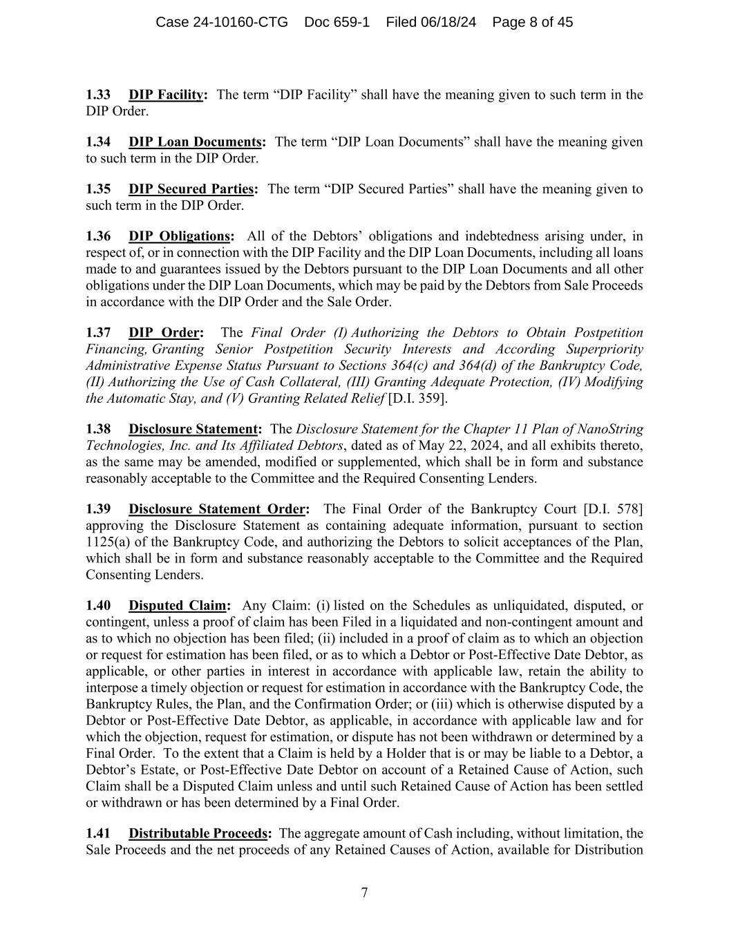 7 1.33 DIP Facility: The term “DIP Facility” shall have the meaning given to such term in the DIP Order. 1.34 DIP Loan Documents: The term “DIP Loan Documents” shall have the meaning given to such term in the DIP Order. 1.35 DIP Secured Parties: The term “DIP Secured Parties” shall have the meaning given to such term in the DIP Order. 1.36 DIP Obligations: All of the Debtors’ obligations and indebtedness arising under, in respect of, or in connection with the DIP Facility and the DIP Loan Documents, including all loans made to and guarantees issued by the Debtors pursuant to the DIP Loan Documents and all other obligations under the DIP Loan Documents, which may be paid by the Debtors from Sale Proceeds in accordance with the DIP Order and the Sale Order. 1.37 DIP Order: The Final Order (I) Authorizing the Debtors to Obtain Postpetition Financing, Granting Senior Postpetition Security Interests and According Superpriority Administrative Expense Status Pursuant to Sections 364(c) and 364(d) of the Bankruptcy Code, (II) Authorizing the Use of Cash Collateral, (III) Granting Adequate Protection, (IV) Modifying the Automatic Stay, and (V) Granting Related Relief [D.I. 359]. 1.38 Disclosure Statement: The Disclosure Statement for the Chapter 11 Plan of NanoString Technologies, Inc. and Its Affiliated Debtors, dated as of May 22, 2024, and all exhibits thereto, as the same may be amended, modified or supplemented, which shall be in form and substance reasonably acceptable to the Committee and the Required Consenting Lenders. 1.39 Disclosure Statement Order: The Final Order of the Bankruptcy Court [D.I. 578] approving the Disclosure Statement as containing adequate information, pursuant to section 1125(a) of the Bankruptcy Code, and authorizing the Debtors to solicit acceptances of the Plan, which shall be in form and substance reasonably acceptable to the Committee and the Required Consenting Lenders. 1.40 Disputed Claim: Any Claim: (i) listed on the Schedules as unliquidated, disputed, or contingent, unless a proof of claim has been Filed in a liquidated and non-contingent amount and as to which no objection has been filed; (ii) included in a proof of claim as to which an objection or request for estimation has been filed, or as to which a Debtor or Post-Effective Date Debtor, as applicable, or other parties in interest in accordance with applicable law, retain the ability to interpose a timely objection or request for estimation in accordance with the Bankruptcy Code, the Bankruptcy Rules, the Plan, and the Confirmation Order; or (iii) which is otherwise disputed by a Debtor or Post-Effective Date Debtor, as applicable, in accordance with applicable law and for which the objection, request for estimation, or dispute has not been withdrawn or determined by a Final Order. To the extent that a Claim is held by a Holder that is or may be liable to a Debtor, a Debtor’s Estate, or Post-Effective Date Debtor on account of a Retained Cause of Action, such Claim shall be a Disputed Claim unless and until such Retained Cause of Action has been settled or withdrawn or has been determined by a Final Order. 1.41 Distributable Proceeds: The aggregate amount of Cash including, without limitation, the Sale Proceeds and the net proceeds of any Retained Causes of Action, available for Distribution Case 24-10160-CTG Doc 659-1 Filed 06/18/24 Page 8 of 45