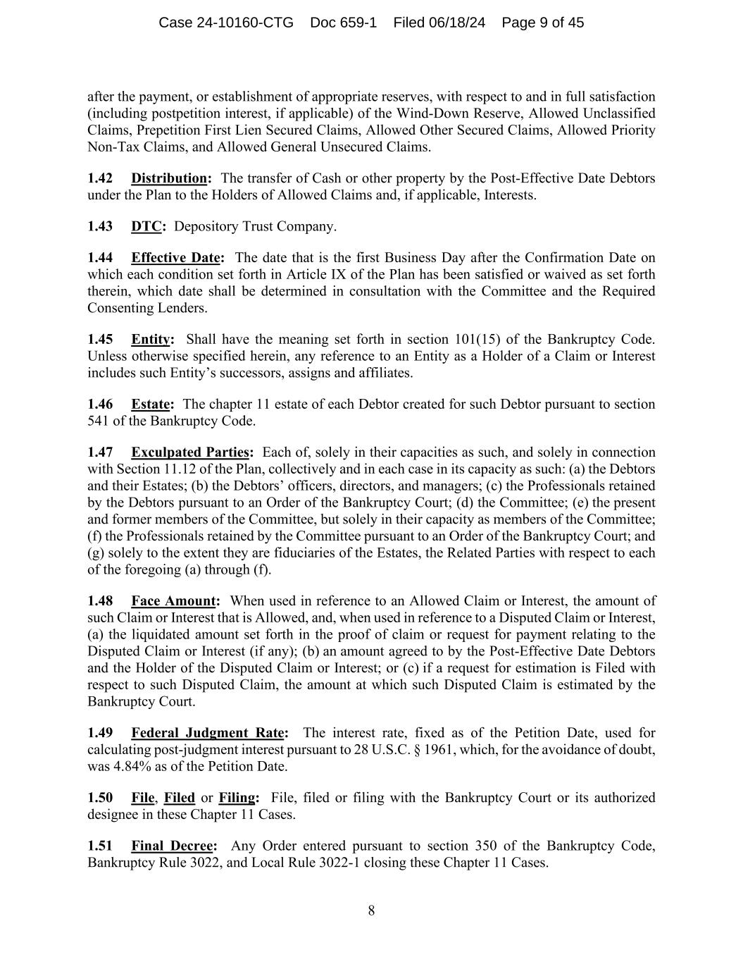 8 after the payment, or establishment of appropriate reserves, with respect to and in full satisfaction (including postpetition interest, if applicable) of the Wind-Down Reserve, Allowed Unclassified Claims, Prepetition First Lien Secured Claims, Allowed Other Secured Claims, Allowed Priority Non-Tax Claims, and Allowed General Unsecured Claims. 1.42 Distribution: The transfer of Cash or other property by the Post-Effective Date Debtors under the Plan to the Holders of Allowed Claims and, if applicable, Interests. 1.43 DTC: Depository Trust Company. 1.44 Effective Date: The date that is the first Business Day after the Confirmation Date on which each condition set forth in Article IX of the Plan has been satisfied or waived as set forth therein, which date shall be determined in consultation with the Committee and the Required Consenting Lenders. 1.45 Entity: Shall have the meaning set forth in section 101(15) of the Bankruptcy Code. Unless otherwise specified herein, any reference to an Entity as a Holder of a Claim or Interest includes such Entity’s successors, assigns and affiliates. 1.46 Estate: The chapter 11 estate of each Debtor created for such Debtor pursuant to section 541 of the Bankruptcy Code. 1.47 Exculpated Parties: Each of, solely in their capacities as such, and solely in connection with Section 11.12 of the Plan, collectively and in each case in its capacity as such: (a) the Debtors and their Estates; (b) the Debtors’ officers, directors, and managers; (c) the Professionals retained by the Debtors pursuant to an Order of the Bankruptcy Court; (d) the Committee; (e) the present and former members of the Committee, but solely in their capacity as members of the Committee; (f) the Professionals retained by the Committee pursuant to an Order of the Bankruptcy Court; and (g) solely to the extent they are fiduciaries of the Estates, the Related Parties with respect to each of the foregoing (a) through (f). 1.48 Face Amount: When used in reference to an Allowed Claim or Interest, the amount of such Claim or Interest that is Allowed, and, when used in reference to a Disputed Claim or Interest, (a) the liquidated amount set forth in the proof of claim or request for payment relating to the Disputed Claim or Interest (if any); (b) an amount agreed to by the Post-Effective Date Debtors and the Holder of the Disputed Claim or Interest; or (c) if a request for estimation is Filed with respect to such Disputed Claim, the amount at which such Disputed Claim is estimated by the Bankruptcy Court. 1.49 Federal Judgment Rate: The interest rate, fixed as of the Petition Date, used for calculating post-judgment interest pursuant to 28 U.S.C. § 1961, which, for the avoidance of doubt, was 4.84% as of the Petition Date. 1.50 File, Filed or Filing: File, filed or filing with the Bankruptcy Court or its authorized designee in these Chapter 11 Cases. 1.51 Final Decree: Any Order entered pursuant to section 350 of the Bankruptcy Code, Bankruptcy Rule 3022, and Local Rule 3022-1 closing these Chapter 11 Cases. Case 24-10160-CTG Doc 659-1 Filed 06/18/24 Page 9 of 45