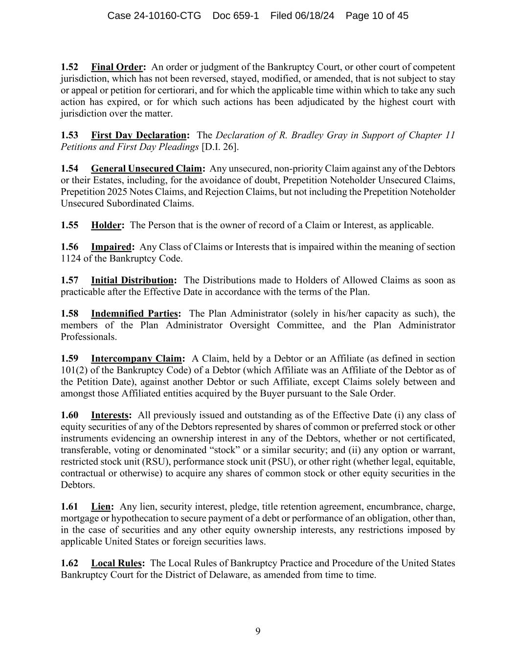 9 1.52 Final Order: An order or judgment of the Bankruptcy Court, or other court of competent jurisdiction, which has not been reversed, stayed, modified, or amended, that is not subject to stay or appeal or petition for certiorari, and for which the applicable time within which to take any such action has expired, or for which such actions has been adjudicated by the highest court with jurisdiction over the matter. 1.53 First Day Declaration: The Declaration of R. Bradley Gray in Support of Chapter 11 Petitions and First Day Pleadings [D.I. 26]. 1.54 General Unsecured Claim: Any unsecured, non-priority Claim against any of the Debtors or their Estates, including, for the avoidance of doubt, Prepetition Noteholder Unsecured Claims, Prepetition 2025 Notes Claims, and Rejection Claims, but not including the Prepetition Noteholder Unsecured Subordinated Claims. 1.55 Holder: The Person that is the owner of record of a Claim or Interest, as applicable. 1.56 Impaired: Any Class of Claims or Interests that is impaired within the meaning of section 1124 of the Bankruptcy Code. 1.57 Initial Distribution: The Distributions made to Holders of Allowed Claims as soon as practicable after the Effective Date in accordance with the terms of the Plan. 1.58 Indemnified Parties: The Plan Administrator (solely in his/her capacity as such), the members of the Plan Administrator Oversight Committee, and the Plan Administrator Professionals. 1.59 Intercompany Claim: A Claim, held by a Debtor or an Affiliate (as defined in section 101(2) of the Bankruptcy Code) of a Debtor (which Affiliate was an Affiliate of the Debtor as of the Petition Date), against another Debtor or such Affiliate, except Claims solely between and amongst those Affiliated entities acquired by the Buyer pursuant to the Sale Order. 1.60 Interests: All previously issued and outstanding as of the Effective Date (i) any class of equity securities of any of the Debtors represented by shares of common or preferred stock or other instruments evidencing an ownership interest in any of the Debtors, whether or not certificated, transferable, voting or denominated “stock” or a similar security; and (ii) any option or warrant, restricted stock unit (RSU), performance stock unit (PSU), or other right (whether legal, equitable, contractual or otherwise) to acquire any shares of common stock or other equity securities in the Debtors. 1.61 Lien: Any lien, security interest, pledge, title retention agreement, encumbrance, charge, mortgage or hypothecation to secure payment of a debt or performance of an obligation, other than, in the case of securities and any other equity ownership interests, any restrictions imposed by applicable United States or foreign securities laws. 1.62 Local Rules: The Local Rules of Bankruptcy Practice and Procedure of the United States Bankruptcy Court for the District of Delaware, as amended from time to time. Case 24-10160-CTG Doc 659-1 Filed 06/18/24 Page 10 of 45