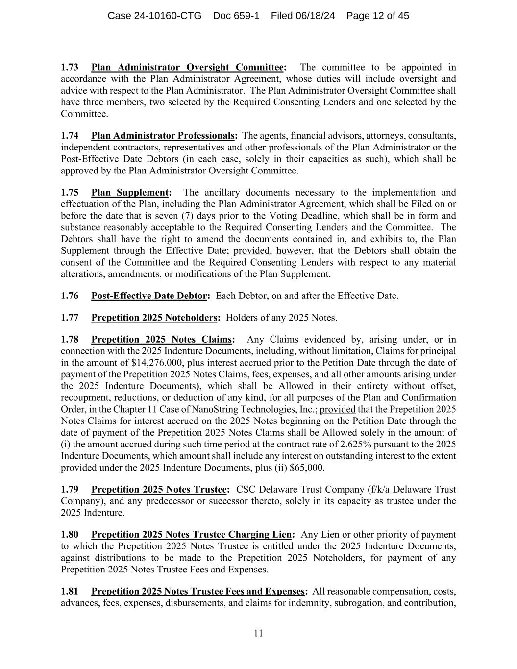 11 1.73 Plan Administrator Oversight Committee: The committee to be appointed in accordance with the Plan Administrator Agreement, whose duties will include oversight and advice with respect to the Plan Administrator. The Plan Administrator Oversight Committee shall have three members, two selected by the Required Consenting Lenders and one selected by the Committee. 1.74 Plan Administrator Professionals: The agents, financial advisors, attorneys, consultants, independent contractors, representatives and other professionals of the Plan Administrator or the Post-Effective Date Debtors (in each case, solely in their capacities as such), which shall be approved by the Plan Administrator Oversight Committee. 1.75 Plan Supplement: The ancillary documents necessary to the implementation and effectuation of the Plan, including the Plan Administrator Agreement, which shall be Filed on or before the date that is seven (7) days prior to the Voting Deadline, which shall be in form and substance reasonably acceptable to the Required Consenting Lenders and the Committee. The Debtors shall have the right to amend the documents contained in, and exhibits to, the Plan Supplement through the Effective Date; provided, however, that the Debtors shall obtain the consent of the Committee and the Required Consenting Lenders with respect to any material alterations, amendments, or modifications of the Plan Supplement. 1.76 Post-Effective Date Debtor: Each Debtor, on and after the Effective Date. 1.77 Prepetition 2025 Noteholders: Holders of any 2025 Notes. 1.78 Prepetition 2025 Notes Claims: Any Claims evidenced by, arising under, or in connection with the 2025 Indenture Documents, including, without limitation, Claims for principal in the amount of $14,276,000, plus interest accrued prior to the Petition Date through the date of payment of the Prepetition 2025 Notes Claims, fees, expenses, and all other amounts arising under the 2025 Indenture Documents), which shall be Allowed in their entirety without offset, recoupment, reductions, or deduction of any kind, for all purposes of the Plan and Confirmation Order, in the Chapter 11 Case of NanoString Technologies, Inc.; provided that the Prepetition 2025 Notes Claims for interest accrued on the 2025 Notes beginning on the Petition Date through the date of payment of the Prepetition 2025 Notes Claims shall be Allowed solely in the amount of (i) the amount accrued during such time period at the contract rate of 2.625% pursuant to the 2025 Indenture Documents, which amount shall include any interest on outstanding interest to the extent provided under the 2025 Indenture Documents, plus (ii) $65,000. 1.79 Prepetition 2025 Notes Trustee: CSC Delaware Trust Company (f/k/a Delaware Trust Company), and any predecessor or successor thereto, solely in its capacity as trustee under the 2025 Indenture. 1.80 Prepetition 2025 Notes Trustee Charging Lien: Any Lien or other priority of payment to which the Prepetition 2025 Notes Trustee is entitled under the 2025 Indenture Documents, against distributions to be made to the Prepetition 2025 Noteholders, for payment of any Prepetition 2025 Notes Trustee Fees and Expenses. 1.81 Prepetition 2025 Notes Trustee Fees and Expenses: All reasonable compensation, costs, advances, fees, expenses, disbursements, and claims for indemnity, subrogation, and contribution, Case 24-10160-CTG Doc 659-1 Filed 06/18/24 Page 12 of 45
