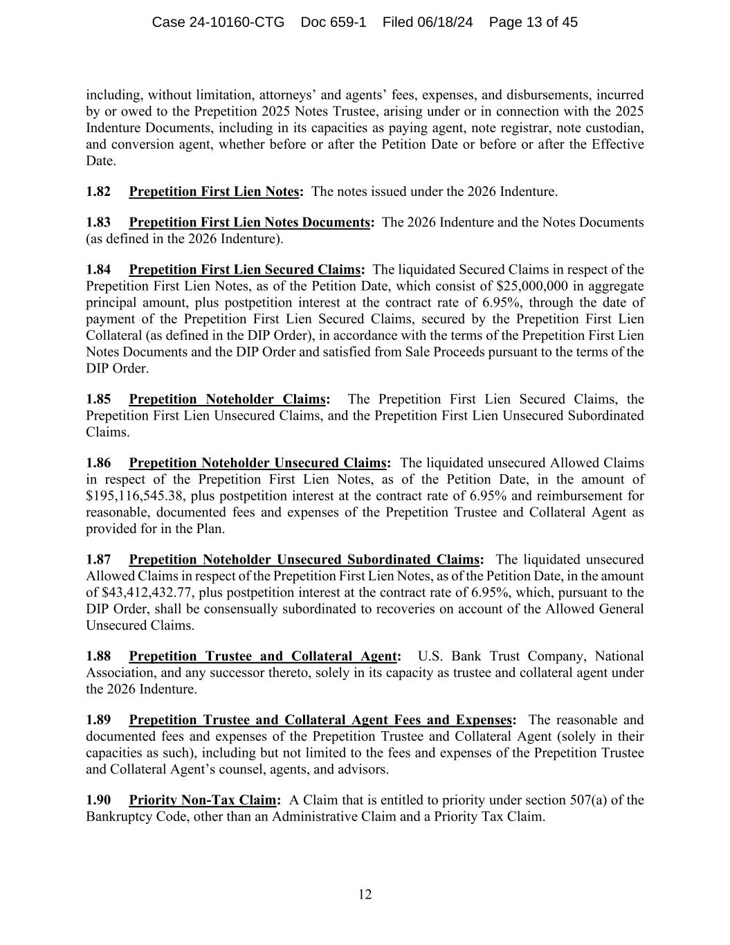 12 including, without limitation, attorneys’ and agents’ fees, expenses, and disbursements, incurred by or owed to the Prepetition 2025 Notes Trustee, arising under or in connection with the 2025 Indenture Documents, including in its capacities as paying agent, note registrar, note custodian, and conversion agent, whether before or after the Petition Date or before or after the Effective Date. 1.82 Prepetition First Lien Notes: The notes issued under the 2026 Indenture. 1.83 Prepetition First Lien Notes Documents: The 2026 Indenture and the Notes Documents (as defined in the 2026 Indenture). 1.84 Prepetition First Lien Secured Claims: The liquidated Secured Claims in respect of the Prepetition First Lien Notes, as of the Petition Date, which consist of $25,000,000 in aggregate principal amount, plus postpetition interest at the contract rate of 6.95%, through the date of payment of the Prepetition First Lien Secured Claims, secured by the Prepetition First Lien Collateral (as defined in the DIP Order), in accordance with the terms of the Prepetition First Lien Notes Documents and the DIP Order and satisfied from Sale Proceeds pursuant to the terms of the DIP Order. 1.85 Prepetition Noteholder Claims: The Prepetition First Lien Secured Claims, the Prepetition First Lien Unsecured Claims, and the Prepetition First Lien Unsecured Subordinated Claims. 1.86 Prepetition Noteholder Unsecured Claims: The liquidated unsecured Allowed Claims in respect of the Prepetition First Lien Notes, as of the Petition Date, in the amount of $195,116,545.38, plus postpetition interest at the contract rate of 6.95% and reimbursement for reasonable, documented fees and expenses of the Prepetition Trustee and Collateral Agent as provided for in the Plan. 1.87 Prepetition Noteholder Unsecured Subordinated Claims: The liquidated unsecured Allowed Claims in respect of the Prepetition First Lien Notes, as of the Petition Date, in the amount of $43,412,432.77, plus postpetition interest at the contract rate of 6.95%, which, pursuant to the DIP Order, shall be consensually subordinated to recoveries on account of the Allowed General Unsecured Claims. 1.88 Prepetition Trustee and Collateral Agent: U.S. Bank Trust Company, National Association, and any successor thereto, solely in its capacity as trustee and collateral agent under the 2026 Indenture. 1.89 Prepetition Trustee and Collateral Agent Fees and Expenses: The reasonable and documented fees and expenses of the Prepetition Trustee and Collateral Agent (solely in their capacities as such), including but not limited to the fees and expenses of the Prepetition Trustee and Collateral Agent’s counsel, agents, and advisors. 1.90 Priority Non-Tax Claim: A Claim that is entitled to priority under section 507(a) of the Bankruptcy Code, other than an Administrative Claim and a Priority Tax Claim. Case 24-10160-CTG Doc 659-1 Filed 06/18/24 Page 13 of 45