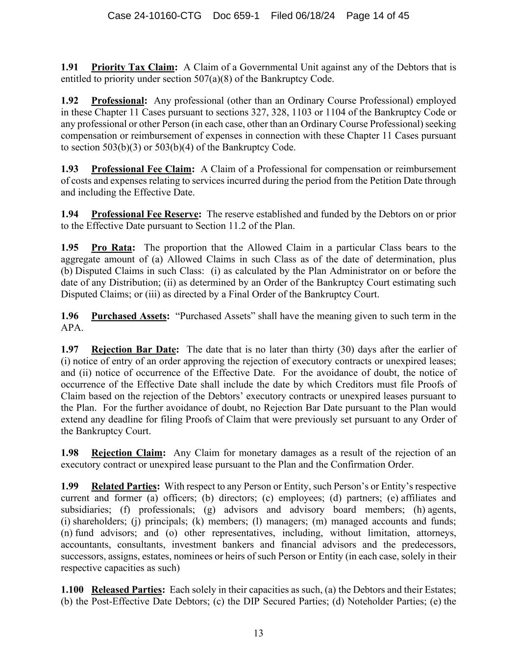 13 1.91 Priority Tax Claim: A Claim of a Governmental Unit against any of the Debtors that is entitled to priority under section 507(a)(8) of the Bankruptcy Code. 1.92 Professional: Any professional (other than an Ordinary Course Professional) employed in these Chapter 11 Cases pursuant to sections 327, 328, 1103 or 1104 of the Bankruptcy Code or any professional or other Person (in each case, other than an Ordinary Course Professional) seeking compensation or reimbursement of expenses in connection with these Chapter 11 Cases pursuant to section 503(b)(3) or 503(b)(4) of the Bankruptcy Code. 1.93 Professional Fee Claim: A Claim of a Professional for compensation or reimbursement of costs and expenses relating to services incurred during the period from the Petition Date through and including the Effective Date. 1.94 Professional Fee Reserve: The reserve established and funded by the Debtors on or prior to the Effective Date pursuant to Section 11.2 of the Plan. 1.95 Pro Rata: The proportion that the Allowed Claim in a particular Class bears to the aggregate amount of (a) Allowed Claims in such Class as of the date of determination, plus (b) Disputed Claims in such Class: (i) as calculated by the Plan Administrator on or before the date of any Distribution; (ii) as determined by an Order of the Bankruptcy Court estimating such Disputed Claims; or (iii) as directed by a Final Order of the Bankruptcy Court. 1.96 Purchased Assets: “Purchased Assets” shall have the meaning given to such term in the APA. 1.97 Rejection Bar Date: The date that is no later than thirty (30) days after the earlier of (i) notice of entry of an order approving the rejection of executory contracts or unexpired leases; and (ii) notice of occurrence of the Effective Date. For the avoidance of doubt, the notice of occurrence of the Effective Date shall include the date by which Creditors must file Proofs of Claim based on the rejection of the Debtors’ executory contracts or unexpired leases pursuant to the Plan. For the further avoidance of doubt, no Rejection Bar Date pursuant to the Plan would extend any deadline for filing Proofs of Claim that were previously set pursuant to any Order of the Bankruptcy Court. 1.98 Rejection Claim: Any Claim for monetary damages as a result of the rejection of an executory contract or unexpired lease pursuant to the Plan and the Confirmation Order. 1.99 Related Parties: With respect to any Person or Entity, such Person’s or Entity’s respective current and former (a) officers; (b) directors; (c) employees; (d) partners; (e) affiliates and subsidiaries; (f) professionals; (g) advisors and advisory board members; (h) agents, (i) shareholders; (j) principals; (k) members; (l) managers; (m) managed accounts and funds; (n) fund advisors; and (o) other representatives, including, without limitation, attorneys, accountants, consultants, investment bankers and financial advisors and the predecessors, successors, assigns, estates, nominees or heirs of such Person or Entity (in each case, solely in their respective capacities as such) 1.100 Released Parties: Each solely in their capacities as such, (a) the Debtors and their Estates; (b) the Post-Effective Date Debtors; (c) the DIP Secured Parties; (d) Noteholder Parties; (e) the Case 24-10160-CTG Doc 659-1 Filed 06/18/24 Page 14 of 45