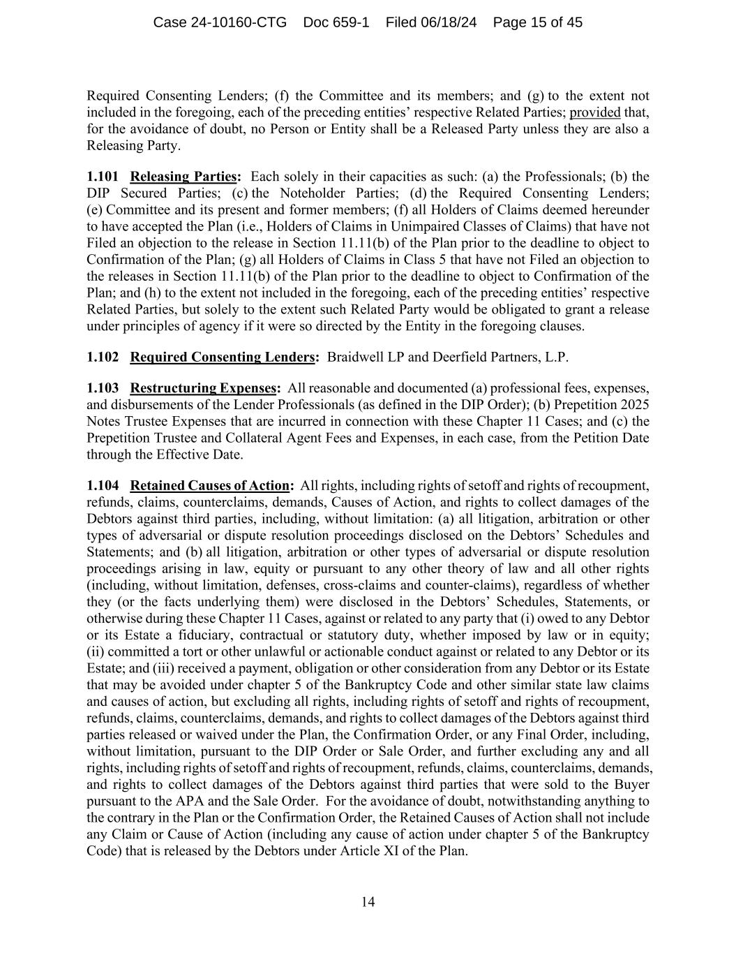 14 Required Consenting Lenders; (f) the Committee and its members; and (g) to the extent not included in the foregoing, each of the preceding entities’ respective Related Parties; provided that, for the avoidance of doubt, no Person or Entity shall be a Released Party unless they are also a Releasing Party. 1.101 Releasing Parties: Each solely in their capacities as such: (a) the Professionals; (b) the DIP Secured Parties; (c) the Noteholder Parties; (d) the Required Consenting Lenders; (e) Committee and its present and former members; (f) all Holders of Claims deemed hereunder to have accepted the Plan (i.e., Holders of Claims in Unimpaired Classes of Claims) that have not Filed an objection to the release in Section 11.11(b) of the Plan prior to the deadline to object to Confirmation of the Plan; (g) all Holders of Claims in Class 5 that have not Filed an objection to the releases in Section 11.11(b) of the Plan prior to the deadline to object to Confirmation of the Plan; and (h) to the extent not included in the foregoing, each of the preceding entities’ respective Related Parties, but solely to the extent such Related Party would be obligated to grant a release under principles of agency if it were so directed by the Entity in the foregoing clauses. 1.102 Required Consenting Lenders: Braidwell LP and Deerfield Partners, L.P. 1.103 Restructuring Expenses: All reasonable and documented (a) professional fees, expenses, and disbursements of the Lender Professionals (as defined in the DIP Order); (b) Prepetition 2025 Notes Trustee Expenses that are incurred in connection with these Chapter 11 Cases; and (c) the Prepetition Trustee and Collateral Agent Fees and Expenses, in each case, from the Petition Date through the Effective Date. 1.104 Retained Causes of Action: All rights, including rights of setoff and rights of recoupment, refunds, claims, counterclaims, demands, Causes of Action, and rights to collect damages of the Debtors against third parties, including, without limitation: (a) all litigation, arbitration or other types of adversarial or dispute resolution proceedings disclosed on the Debtors’ Schedules and Statements; and (b) all litigation, arbitration or other types of adversarial or dispute resolution proceedings arising in law, equity or pursuant to any other theory of law and all other rights (including, without limitation, defenses, cross-claims and counter-claims), regardless of whether they (or the facts underlying them) were disclosed in the Debtors’ Schedules, Statements, or otherwise during these Chapter 11 Cases, against or related to any party that (i) owed to any Debtor or its Estate a fiduciary, contractual or statutory duty, whether imposed by law or in equity; (ii) committed a tort or other unlawful or actionable conduct against or related to any Debtor or its Estate; and (iii) received a payment, obligation or other consideration from any Debtor or its Estate that may be avoided under chapter 5 of the Bankruptcy Code and other similar state law claims and causes of action, but excluding all rights, including rights of setoff and rights of recoupment, refunds, claims, counterclaims, demands, and rights to collect damages of the Debtors against third parties released or waived under the Plan, the Confirmation Order, or any Final Order, including, without limitation, pursuant to the DIP Order or Sale Order, and further excluding any and all rights, including rights of setoff and rights of recoupment, refunds, claims, counterclaims, demands, and rights to collect damages of the Debtors against third parties that were sold to the Buyer pursuant to the APA and the Sale Order. For the avoidance of doubt, notwithstanding anything to the contrary in the Plan or the Confirmation Order, the Retained Causes of Action shall not include any Claim or Cause of Action (including any cause of action under chapter 5 of the Bankruptcy Code) that is released by the Debtors under Article XI of the Plan. Case 24-10160-CTG Doc 659-1 Filed 06/18/24 Page 15 of 45