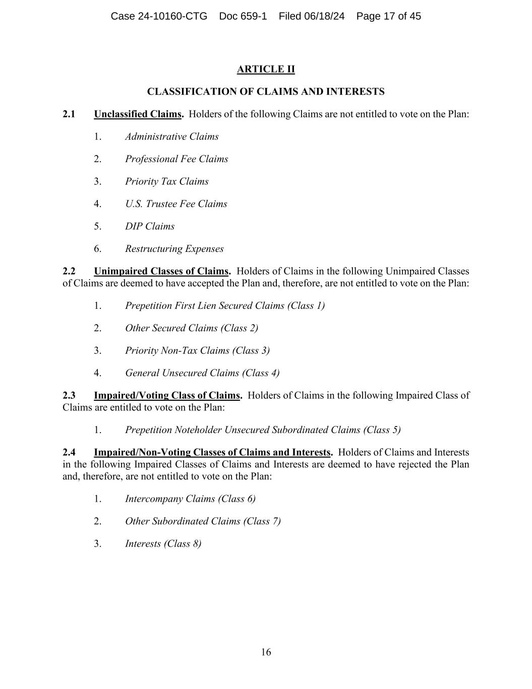 16 ARTICLE II CLASSIFICATION OF CLAIMS AND INTERESTS 2.1 Unclassified Claims. Holders of the following Claims are not entitled to vote on the Plan: 1. Administrative Claims 2. Professional Fee Claims 3. Priority Tax Claims 4. U.S. Trustee Fee Claims 5. DIP Claims 6. Restructuring Expenses 2.2 Unimpaired Classes of Claims. Holders of Claims in the following Unimpaired Classes of Claims are deemed to have accepted the Plan and, therefore, are not entitled to vote on the Plan: 1. Prepetition First Lien Secured Claims (Class 1) 2. Other Secured Claims (Class 2) 3. Priority Non-Tax Claims (Class 3) 4. General Unsecured Claims (Class 4) 2.3 Impaired/Voting Class of Claims. Holders of Claims in the following Impaired Class of Claims are entitled to vote on the Plan: 1. Prepetition Noteholder Unsecured Subordinated Claims (Class 5) 2.4 Impaired/Non-Voting Classes of Claims and Interests. Holders of Claims and Interests in the following Impaired Classes of Claims and Interests are deemed to have rejected the Plan and, therefore, are not entitled to vote on the Plan: 1. Intercompany Claims (Class 6) 2. Other Subordinated Claims (Class 7) 3. Interests (Class 8) Case 24-10160-CTG Doc 659-1 Filed 06/18/24 Page 17 of 45