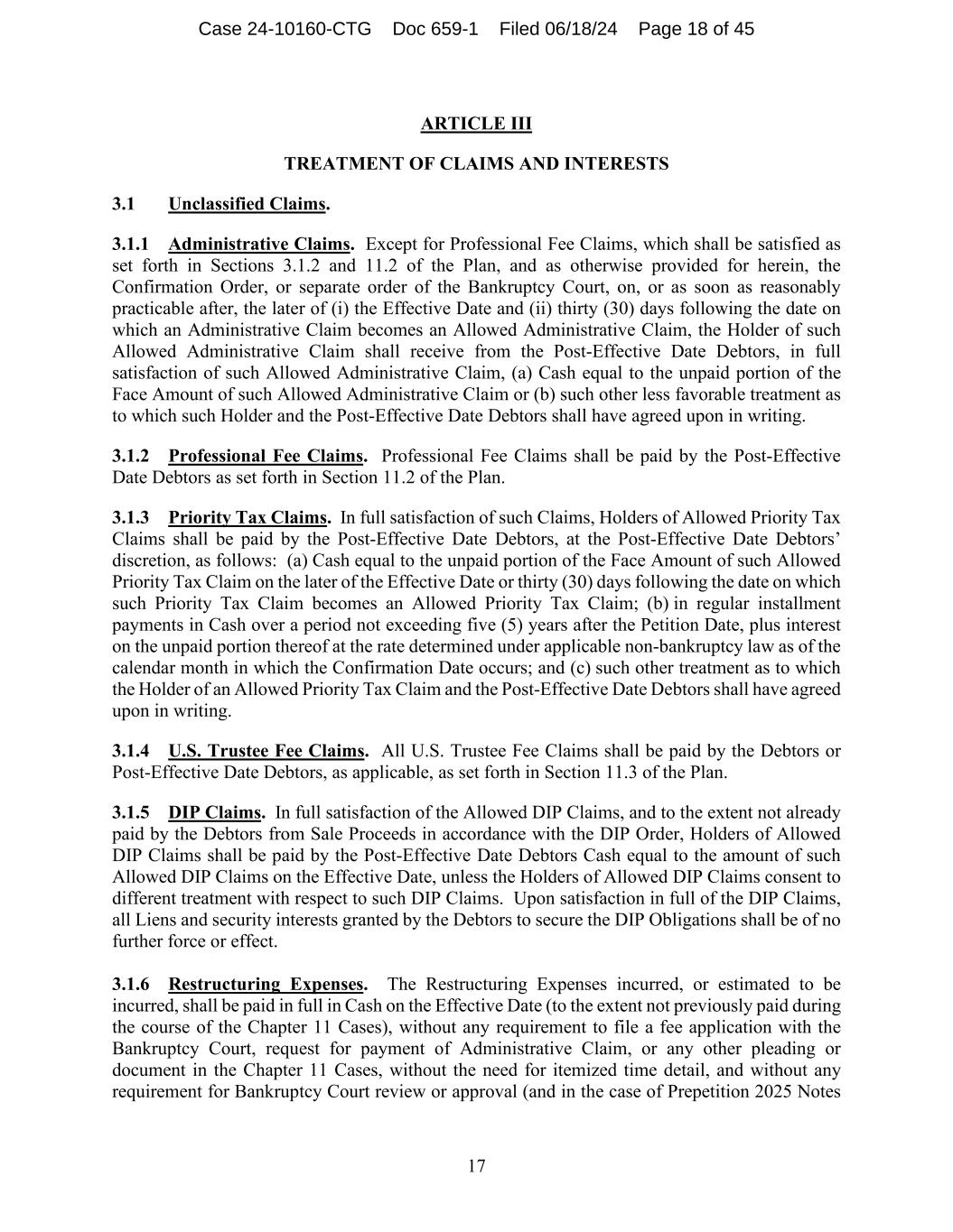 17 ARTICLE III TREATMENT OF CLAIMS AND INTERESTS 3.1 Unclassified Claims. 3.1.1 Administrative Claims. Except for Professional Fee Claims, which shall be satisfied as set forth in Sections 3.1.2 and 11.2 of the Plan, and as otherwise provided for herein, the Confirmation Order, or separate order of the Bankruptcy Court, on, or as soon as reasonably practicable after, the later of (i) the Effective Date and (ii) thirty (30) days following the date on which an Administrative Claim becomes an Allowed Administrative Claim, the Holder of such Allowed Administrative Claim shall receive from the Post-Effective Date Debtors, in full satisfaction of such Allowed Administrative Claim, (a) Cash equal to the unpaid portion of the Face Amount of such Allowed Administrative Claim or (b) such other less favorable treatment as to which such Holder and the Post-Effective Date Debtors shall have agreed upon in writing. 3.1.2 Professional Fee Claims. Professional Fee Claims shall be paid by the Post-Effective Date Debtors as set forth in Section 11.2 of the Plan. 3.1.3 Priority Tax Claims. In full satisfaction of such Claims, Holders of Allowed Priority Tax Claims shall be paid by the Post-Effective Date Debtors, at the Post-Effective Date Debtors’ discretion, as follows: (a) Cash equal to the unpaid portion of the Face Amount of such Allowed Priority Tax Claim on the later of the Effective Date or thirty (30) days following the date on which such Priority Tax Claim becomes an Allowed Priority Tax Claim; (b) in regular installment payments in Cash over a period not exceeding five (5) years after the Petition Date, plus interest on the unpaid portion thereof at the rate determined under applicable non-bankruptcy law as of the calendar month in which the Confirmation Date occurs; and (c) such other treatment as to which the Holder of an Allowed Priority Tax Claim and the Post-Effective Date Debtors shall have agreed upon in writing. 3.1.4 U.S. Trustee Fee Claims. All U.S. Trustee Fee Claims shall be paid by the Debtors or Post-Effective Date Debtors, as applicable, as set forth in Section 11.3 of the Plan. 3.1.5 DIP Claims. In full satisfaction of the Allowed DIP Claims, and to the extent not already paid by the Debtors from Sale Proceeds in accordance with the DIP Order, Holders of Allowed DIP Claims shall be paid by the Post-Effective Date Debtors Cash equal to the amount of such Allowed DIP Claims on the Effective Date, unless the Holders of Allowed DIP Claims consent to different treatment with respect to such DIP Claims. Upon satisfaction in full of the DIP Claims, all Liens and security interests granted by the Debtors to secure the DIP Obligations shall be of no further force or effect. 3.1.6 Restructuring Expenses. The Restructuring Expenses incurred, or estimated to be incurred, shall be paid in full in Cash on the Effective Date (to the extent not previously paid during the course of the Chapter 11 Cases), without any requirement to file a fee application with the Bankruptcy Court, request for payment of Administrative Claim, or any other pleading or document in the Chapter 11 Cases, without the need for itemized time detail, and without any requirement for Bankruptcy Court review or approval (and in the case of Prepetition 2025 Notes Case 24-10160-CTG Doc 659-1 Filed 06/18/24 Page 18 of 45
