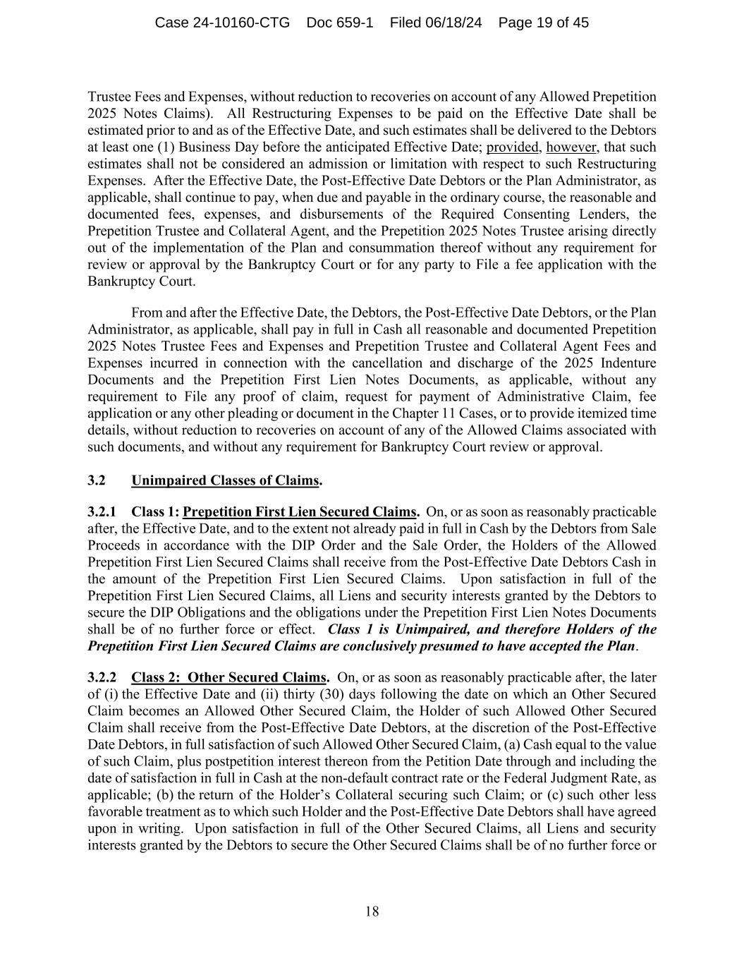 18 Trustee Fees and Expenses, without reduction to recoveries on account of any Allowed Prepetition 2025 Notes Claims). All Restructuring Expenses to be paid on the Effective Date shall be estimated prior to and as of the Effective Date, and such estimates shall be delivered to the Debtors at least one (1) Business Day before the anticipated Effective Date; provided, however, that such estimates shall not be considered an admission or limitation with respect to such Restructuring Expenses. After the Effective Date, the Post-Effective Date Debtors or the Plan Administrator, as applicable, shall continue to pay, when due and payable in the ordinary course, the reasonable and documented fees, expenses, and disbursements of the Required Consenting Lenders, the Prepetition Trustee and Collateral Agent, and the Prepetition 2025 Notes Trustee arising directly out of the implementation of the Plan and consummation thereof without any requirement for review or approval by the Bankruptcy Court or for any party to File a fee application with the Bankruptcy Court. From and after the Effective Date, the Debtors, the Post-Effective Date Debtors, or the Plan Administrator, as applicable, shall pay in full in Cash all reasonable and documented Prepetition 2025 Notes Trustee Fees and Expenses and Prepetition Trustee and Collateral Agent Fees and Expenses incurred in connection with the cancellation and discharge of the 2025 Indenture Documents and the Prepetition First Lien Notes Documents, as applicable, without any requirement to File any proof of claim, request for payment of Administrative Claim, fee application or any other pleading or document in the Chapter 11 Cases, or to provide itemized time details, without reduction to recoveries on account of any of the Allowed Claims associated with such documents, and without any requirement for Bankruptcy Court review or approval. 3.2 Unimpaired Classes of Claims. 3.2.1 Class 1: Prepetition First Lien Secured Claims. On, or as soon as reasonably practicable after, the Effective Date, and to the extent not already paid in full in Cash by the Debtors from Sale Proceeds in accordance with the DIP Order and the Sale Order, the Holders of the Allowed Prepetition First Lien Secured Claims shall receive from the Post-Effective Date Debtors Cash in the amount of the Prepetition First Lien Secured Claims. Upon satisfaction in full of the Prepetition First Lien Secured Claims, all Liens and security interests granted by the Debtors to secure the DIP Obligations and the obligations under the Prepetition First Lien Notes Documents shall be of no further force or effect. Class 1 is Unimpaired, and therefore Holders of the Prepetition First Lien Secured Claims are conclusively presumed to have accepted the Plan. 3.2.2 Class 2: Other Secured Claims. On, or as soon as reasonably practicable after, the later of (i) the Effective Date and (ii) thirty (30) days following the date on which an Other Secured Claim becomes an Allowed Other Secured Claim, the Holder of such Allowed Other Secured Claim shall receive from the Post-Effective Date Debtors, at the discretion of the Post-Effective Date Debtors, in full satisfaction of such Allowed Other Secured Claim, (a) Cash equal to the value of such Claim, plus postpetition interest thereon from the Petition Date through and including the date of satisfaction in full in Cash at the non-default contract rate or the Federal Judgment Rate, as applicable; (b) the return of the Holder’s Collateral securing such Claim; or (c) such other less favorable treatment as to which such Holder and the Post-Effective Date Debtors shall have agreed upon in writing. Upon satisfaction in full of the Other Secured Claims, all Liens and security interests granted by the Debtors to secure the Other Secured Claims shall be of no further force or Case 24-10160-CTG Doc 659-1 Filed 06/18/24 Page 19 of 45