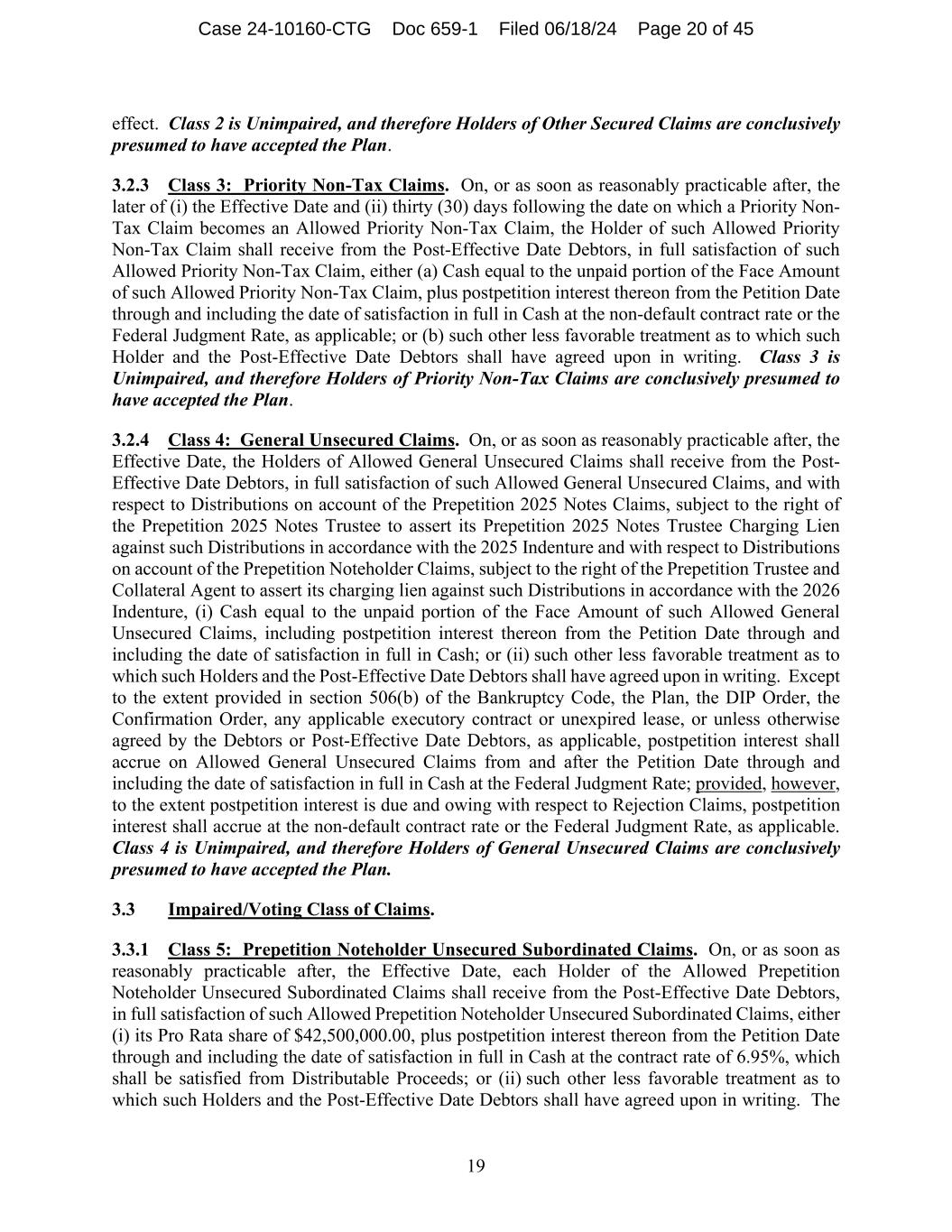 19 effect. Class 2 is Unimpaired, and therefore Holders of Other Secured Claims are conclusively presumed to have accepted the Plan. 3.2.3 Class 3: Priority Non-Tax Claims. On, or as soon as reasonably practicable after, the later of (i) the Effective Date and (ii) thirty (30) days following the date on which a Priority Non- Tax Claim becomes an Allowed Priority Non-Tax Claim, the Holder of such Allowed Priority Non-Tax Claim shall receive from the Post-Effective Date Debtors, in full satisfaction of such Allowed Priority Non-Tax Claim, either (a) Cash equal to the unpaid portion of the Face Amount of such Allowed Priority Non-Tax Claim, plus postpetition interest thereon from the Petition Date through and including the date of satisfaction in full in Cash at the non-default contract rate or the Federal Judgment Rate, as applicable; or (b) such other less favorable treatment as to which such Holder and the Post-Effective Date Debtors shall have agreed upon in writing. Class 3 is Unimpaired, and therefore Holders of Priority Non-Tax Claims are conclusively presumed to have accepted the Plan. 3.2.4 Class 4: General Unsecured Claims. On, or as soon as reasonably practicable after, the Effective Date, the Holders of Allowed General Unsecured Claims shall receive from the Post- Effective Date Debtors, in full satisfaction of such Allowed General Unsecured Claims, and with respect to Distributions on account of the Prepetition 2025 Notes Claims, subject to the right of the Prepetition 2025 Notes Trustee to assert its Prepetition 2025 Notes Trustee Charging Lien against such Distributions in accordance with the 2025 Indenture and with respect to Distributions on account of the Prepetition Noteholder Claims, subject to the right of the Prepetition Trustee and Collateral Agent to assert its charging lien against such Distributions in accordance with the 2026 Indenture, (i) Cash equal to the unpaid portion of the Face Amount of such Allowed General Unsecured Claims, including postpetition interest thereon from the Petition Date through and including the date of satisfaction in full in Cash; or (ii) such other less favorable treatment as to which such Holders and the Post-Effective Date Debtors shall have agreed upon in writing. Except to the extent provided in section 506(b) of the Bankruptcy Code, the Plan, the DIP Order, the Confirmation Order, any applicable executory contract or unexpired lease, or unless otherwise agreed by the Debtors or Post-Effective Date Debtors, as applicable, postpetition interest shall accrue on Allowed General Unsecured Claims from and after the Petition Date through and including the date of satisfaction in full in Cash at the Federal Judgment Rate; provided, however, to the extent postpetition interest is due and owing with respect to Rejection Claims, postpetition interest shall accrue at the non-default contract rate or the Federal Judgment Rate, as applicable. Class 4 is Unimpaired, and therefore Holders of General Unsecured Claims are conclusively presumed to have accepted the Plan. 3.3 Impaired/Voting Class of Claims. 3.3.1 Class 5: Prepetition Noteholder Unsecured Subordinated Claims. On, or as soon as reasonably practicable after, the Effective Date, each Holder of the Allowed Prepetition Noteholder Unsecured Subordinated Claims shall receive from the Post-Effective Date Debtors, in full satisfaction of such Allowed Prepetition Noteholder Unsecured Subordinated Claims, either (i) its Pro Rata share of $42,500,000.00, plus postpetition interest thereon from the Petition Date through and including the date of satisfaction in full in Cash at the contract rate of 6.95%, which shall be satisfied from Distributable Proceeds; or (ii) such other less favorable treatment as to which such Holders and the Post-Effective Date Debtors shall have agreed upon in writing. The Case 24-10160-CTG Doc 659-1 Filed 06/18/24 Page 20 of 45