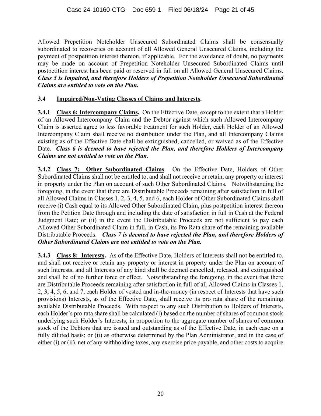 20 Allowed Prepetition Noteholder Unsecured Subordinated Claims shall be consensually subordinated to recoveries on account of all Allowed General Unsecured Claims, including the payment of postpetition interest thereon, if applicable. For the avoidance of doubt, no payments may be made on account of Prepetition Noteholder Unsecured Subordinated Claims until postpetition interest has been paid or reserved in full on all Allowed General Unsecured Claims. Class 5 is Impaired, and therefore Holders of Prepetition Noteholder Unsecured Subordinated Claims are entitled to vote on the Plan. 3.4 Impaired/Non-Voting Classes of Claims and Interests. 3.4.1 Class 6: Intercompany Claims. On the Effective Date, except to the extent that a Holder of an Allowed Intercompany Claim and the Debtor against which such Allowed Intercompany Claim is asserted agree to less favorable treatment for such Holder, each Holder of an Allowed Intercompany Claim shall receive no distribution under the Plan, and all Intercompany Claims existing as of the Effective Date shall be extinguished, cancelled, or waived as of the Effective Date. Class 6 is deemed to have rejected the Plan, and therefore Holders of Intercompany Claims are not entitled to vote on the Plan. 3.4.2 Class 7: Other Subordinated Claims. On the Effective Date, Holders of Other Subordinated Claims shall not be entitled to, and shall not receive or retain, any property or interest in property under the Plan on account of such Other Subordinated Claims. Notwithstanding the foregoing, in the event that there are Distributable Proceeds remaining after satisfaction in full of all Allowed Claims in Classes 1, 2, 3, 4, 5, and 6, each Holder of Other Subordinated Claims shall receive (i) Cash equal to its Allowed Other Subordinated Claim, plus postpetition interest thereon from the Petition Date through and including the date of satisfaction in full in Cash at the Federal Judgment Rate; or (ii) in the event the Distributable Proceeds are not sufficient to pay each Allowed Other Subordinated Claim in full, in Cash, its Pro Rata share of the remaining available Distributable Proceeds. Class 7 is deemed to have rejected the Plan, and therefore Holders of Other Subordinated Claims are not entitled to vote on the Plan. 3.4.3 Class 8: Interests. As of the Effective Date, Holders of Interests shall not be entitled to, and shall not receive or retain any property or interest in property under the Plan on account of such Interests, and all Interests of any kind shall be deemed cancelled, released, and extinguished and shall be of no further force or effect. Notwithstanding the foregoing, in the event that there are Distributable Proceeds remaining after satisfaction in full of all Allowed Claims in Classes 1, 2, 3, 4, 5, 6, and 7, each Holder of vested and in-the-money (in respect of Interests that have such provisions) Interests, as of the Effective Date, shall receive its pro rata share of the remaining available Distributable Proceeds. With respect to any such Distribution to Holders of Interests, each Holder’s pro rata share shall be calculated (i) based on the number of shares of common stock underlying such Holder’s Interests, in proportion to the aggregate number of shares of common stock of the Debtors that are issued and outstanding as of the Effective Date, in each case on a fully diluted basis; or (ii) as otherwise determined by the Plan Administrator, and in the case of either (i) or (ii), net of any withholding taxes, any exercise price payable, and other costs to acquire Case 24-10160-CTG Doc 659-1 Filed 06/18/24 Page 21 of 45