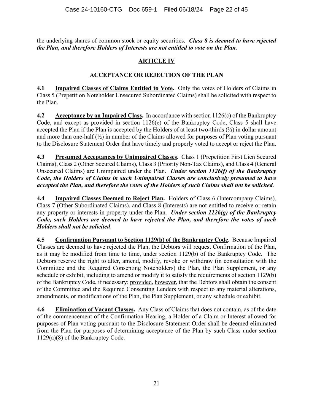 21 the underlying shares of common stock or equity securities. Class 8 is deemed to have rejected the Plan, and therefore Holders of Interests are not entitled to vote on the Plan. ARTICLE IV ACCEPTANCE OR REJECTION OF THE PLAN 4.1 Impaired Classes of Claims Entitled to Vote. Only the votes of Holders of Claims in Class 5 (Prepetition Noteholder Unsecured Subordinated Claims) shall be solicited with respect to the Plan. 4.2 Acceptance by an Impaired Class. In accordance with section 1126(c) of the Bankruptcy Code, and except as provided in section 1126(e) of the Bankruptcy Code, Class 5 shall have accepted the Plan if the Plan is accepted by the Holders of at least two-thirds (⅔) in dollar amount and more than one-half (½) in number of the Claims allowed for purposes of Plan voting pursuant to the Disclosure Statement Order that have timely and properly voted to accept or reject the Plan. 4.3 Presumed Acceptances by Unimpaired Classes. Class 1 (Prepetition First Lien Secured Claims), Class 2 (Other Secured Claims), Class 3 (Priority Non-Tax Claims), and Class 4 (General Unsecured Claims) are Unimpaired under the Plan. Under section 1126(f) of the Bankruptcy Code, the Holders of Claims in such Unimpaired Classes are conclusively presumed to have accepted the Plan, and therefore the votes of the Holders of such Claims shall not be solicited. 4.4 Impaired Classes Deemed to Reject Plan. Holders of Class 6 (Intercompany Claims), Class 7 (Other Subordinated Claims), and Class 8 (Interests) are not entitled to receive or retain any property or interests in property under the Plan. Under section 1126(g) of the Bankruptcy Code, such Holders are deemed to have rejected the Plan, and therefore the votes of such Holders shall not be solicited. 4.5 Confirmation Pursuant to Section 1129(b) of the Bankruptcy Code. Because Impaired Classes are deemed to have rejected the Plan, the Debtors will request Confirmation of the Plan, as it may be modified from time to time, under section 1129(b) of the Bankruptcy Code. The Debtors reserve the right to alter, amend, modify, revoke or withdraw (in consultation with the Committee and the Required Consenting Noteholders) the Plan, the Plan Supplement, or any schedule or exhibit, including to amend or modify it to satisfy the requirements of section 1129(b) of the Bankruptcy Code, if necessary; provided, however, that the Debtors shall obtain the consent of the Committee and the Required Consenting Lenders with respect to any material alterations, amendments, or modifications of the Plan, the Plan Supplement, or any schedule or exhibit. 4.6 Elimination of Vacant Classes. Any Class of Claims that does not contain, as of the date of the commencement of the Confirmation Hearing, a Holder of a Claim or Interest allowed for purposes of Plan voting pursuant to the Disclosure Statement Order shall be deemed eliminated from the Plan for purposes of determining acceptance of the Plan by such Class under section 1129(a)(8) of the Bankruptcy Code. Case 24-10160-CTG Doc 659-1 Filed 06/18/24 Page 22 of 45
