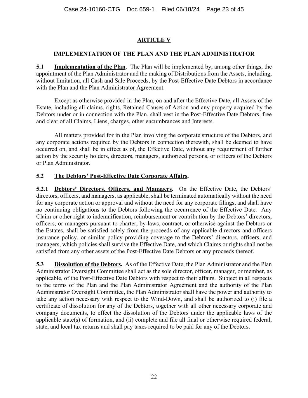 22 ARTICLE V IMPLEMENTATION OF THE PLAN AND THE PLAN ADMINISTRATOR 5.1 Implementation of the Plan. The Plan will be implemented by, among other things, the appointment of the Plan Administrator and the making of Distributions from the Assets, including, without limitation, all Cash and Sale Proceeds, by the Post-Effective Date Debtors in accordance with the Plan and the Plan Administrator Agreement. Except as otherwise provided in the Plan, on and after the Effective Date, all Assets of the Estate, including all claims, rights, Retained Causes of Action and any property acquired by the Debtors under or in connection with the Plan, shall vest in the Post-Effective Date Debtors, free and clear of all Claims, Liens, charges, other encumbrances and Interests. All matters provided for in the Plan involving the corporate structure of the Debtors, and any corporate actions required by the Debtors in connection therewith, shall be deemed to have occurred on, and shall be in effect as of, the Effective Date, without any requirement of further action by the security holders, directors, managers, authorized persons, or officers of the Debtors or Plan Administrator. 5.2 The Debtors’ Post-Effective Date Corporate Affairs. 5.2.1 Debtors’ Directors, Officers, and Managers. On the Effective Date, the Debtors’ directors, officers, and managers, as applicable, shall be terminated automatically without the need for any corporate action or approval and without the need for any corporate filings, and shall have no continuing obligations to the Debtors following the occurrence of the Effective Date. Any Claim or other right to indemnification, reimbursement or contribution by the Debtors’ directors, officers, or managers pursuant to charter, by-laws, contract, or otherwise against the Debtors or the Estates, shall be satisfied solely from the proceeds of any applicable directors and officers insurance policy, or similar policy providing coverage to the Debtors’ directors, officers, and managers, which policies shall survive the Effective Date, and which Claims or rights shall not be satisfied from any other assets of the Post-Effective Date Debtors or any proceeds thereof. 5.3 Dissolution of the Debtors. As of the Effective Date, the Plan Administrator and the Plan Administrator Oversight Committee shall act as the sole director, officer, manager, or member, as applicable, of the Post-Effective Date Debtors with respect to their affairs. Subject in all respects to the terms of the Plan and the Plan Administrator Agreement and the authority of the Plan Administrator Oversight Committee, the Plan Administrator shall have the power and authority to take any action necessary with respect to the Wind-Down, and shall be authorized to (i) file a certificate of dissolution for any of the Debtors, together with all other necessary corporate and company documents, to effect the dissolution of the Debtors under the applicable laws of the applicable state(s) of formation, and (ii) complete and file all final or otherwise required federal, state, and local tax returns and shall pay taxes required to be paid for any of the Debtors. Case 24-10160-CTG Doc 659-1 Filed 06/18/24 Page 23 of 45