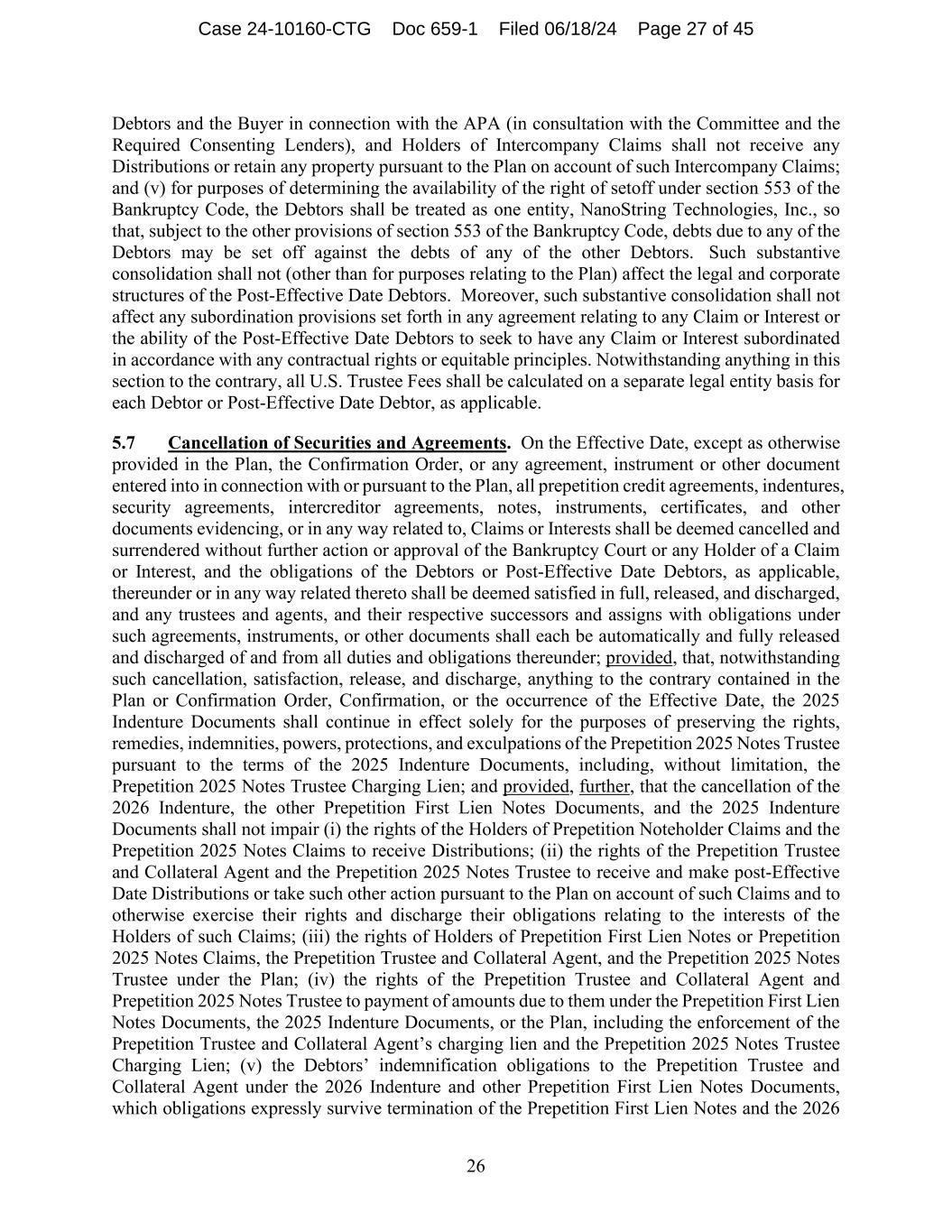 26 Debtors and the Buyer in connection with the APA (in consultation with the Committee and the Required Consenting Lenders), and Holders of Intercompany Claims shall not receive any Distributions or retain any property pursuant to the Plan on account of such Intercompany Claims; and (v) for purposes of determining the availability of the right of setoff under section 553 of the Bankruptcy Code, the Debtors shall be treated as one entity, NanoString Technologies, Inc., so that, subject to the other provisions of section 553 of the Bankruptcy Code, debts due to any of the Debtors may be set off against the debts of any of the other Debtors. Such substantive consolidation shall not (other than for purposes relating to the Plan) affect the legal and corporate structures of the Post-Effective Date Debtors. Moreover, such substantive consolidation shall not affect any subordination provisions set forth in any agreement relating to any Claim or Interest or the ability of the Post-Effective Date Debtors to seek to have any Claim or Interest subordinated in accordance with any contractual rights or equitable principles. Notwithstanding anything in this section to the contrary, all U.S. Trustee Fees shall be calculated on a separate legal entity basis for each Debtor or Post-Effective Date Debtor, as applicable. 5.7 Cancellation of Securities and Agreements. On the Effective Date, except as otherwise provided in the Plan, the Confirmation Order, or any agreement, instrument or other document entered into in connection with or pursuant to the Plan, all prepetition credit agreements, indentures, security agreements, intercreditor agreements, notes, instruments, certificates, and other documents evidencing, or in any way related to, Claims or Interests shall be deemed cancelled and surrendered without further action or approval of the Bankruptcy Court or any Holder of a Claim or Interest, and the obligations of the Debtors or Post-Effective Date Debtors, as applicable, thereunder or in any way related thereto shall be deemed satisfied in full, released, and discharged, and any trustees and agents, and their respective successors and assigns with obligations under such agreements, instruments, or other documents shall each be automatically and fully released and discharged of and from all duties and obligations thereunder; provided, that, notwithstanding such cancellation, satisfaction, release, and discharge, anything to the contrary contained in the Plan or Confirmation Order, Confirmation, or the occurrence of the Effective Date, the 2025 Indenture Documents shall continue in effect solely for the purposes of preserving the rights, remedies, indemnities, powers, protections, and exculpations of the Prepetition 2025 Notes Trustee pursuant to the terms of the 2025 Indenture Documents, including, without limitation, the Prepetition 2025 Notes Trustee Charging Lien; and provided, further, that the cancellation of the 2026 Indenture, the other Prepetition First Lien Notes Documents, and the 2025 Indenture Documents shall not impair (i) the rights of the Holders of Prepetition Noteholder Claims and the Prepetition 2025 Notes Claims to receive Distributions; (ii) the rights of the Prepetition Trustee and Collateral Agent and the Prepetition 2025 Notes Trustee to receive and make post-Effective Date Distributions or take such other action pursuant to the Plan on account of such Claims and to otherwise exercise their rights and discharge their obligations relating to the interests of the Holders of such Claims; (iii) the rights of Holders of Prepetition First Lien Notes or Prepetition 2025 Notes Claims, the Prepetition Trustee and Collateral Agent, and the Prepetition 2025 Notes Trustee under the Plan; (iv) the rights of the Prepetition Trustee and Collateral Agent and Prepetition 2025 Notes Trustee to payment of amounts due to them under the Prepetition First Lien Notes Documents, the 2025 Indenture Documents, or the Plan, including the enforcement of the Prepetition Trustee and Collateral Agent’s charging lien and the Prepetition 2025 Notes Trustee Charging Lien; (v) the Debtors’ indemnification obligations to the Prepetition Trustee and Collateral Agent under the 2026 Indenture and other Prepetition First Lien Notes Documents, which obligations expressly survive termination of the Prepetition First Lien Notes and the 2026 Case 24-10160-CTG Doc 659-1 Filed 06/18/24 Page 27 of 45
